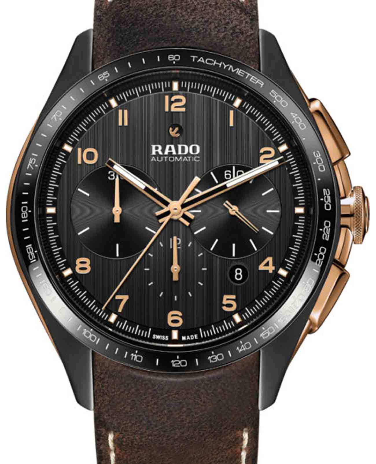 Мужские швейцарские часы-хронографХронографФункция позволяет измерять отрезки времени с особой точностью: часы, минуты, секунды. Верным признаком хронографа является наличие на циферблате 3 дополнительных окошек-счётчиков. Rado HyperChrome Automatic Chronograph R32503166. Корпус часов изготовлен из нержавеющей стали с PVD-покрытиемPVDУльтратонкое покрытие наносится в технике вакуумного напыления, сочетает в себе нитрид титана особой прочности со слоем золота или оксида хрома. Несёт в себе декоративную или защитную функцию. и высокотехнологичной керамикиВысокотехнологичная керамикаИнновационный запатентованный Rado материал с гладкой или матовой поверхностью. Керамика за счёт кристаллической структуры обладает повышенной устойчивостью от возникновения царапин. Материал способен принимать температуру тела человека, обеспечивая невероятный комфорт при ношении.. Сапфировое стеклоСапфировое стеклоПрочный и надёжный материал из кристалла сапфира синтетического происхождения, характеризующийся особой твёрдостью и устойчивостью к царапинам и повреждениям. устойчивое к мелким механическим повреждениям. БезельБезельВнешний ободок, закрепляющий стекло. В спортивных часах так называется поворотное кольцо с делениями на циферблате, выполняет роль таймера – замеряет отрезки времени на шкале. Неподвижный безель – элемент декора. Однонаправленно вращающийся безель на дайверских часах позволяет фиксировать моменты погружения и выныривания на поверхность. со шкалой тахиметраТахиметрРазмеченная шкала, располагается на ободке или безеле часов. Тахиметр позволяет рассчитать скорость на определённом участке пути, расстояние измеряется в километрах или милях.. Стрелки и метки с люминесцентным покрытиемЛюминесцентное покрытиеПозволяет считывать показания времени в темноте. Производители наносят на стрелки, часовые индексы, безель или поверхность циферблата светонакопительный состав, дающий холодное свечение.. Окошко даты находится в положении между 4 и 5 часов. Класс водозащиты: 100 метров, позволит плавать, нырять и заниматься другими водными видами спорта. Кожаный ремешок на раскладной застёжкеРаскладная застёжкаТакой тип застёжки используется только на браслетах из металла. Она никогда не раскрывается полностью, происходит разделение на 2 и более частей. Раскладывающая застёжка снизит вероятность потери часов к минимуму..