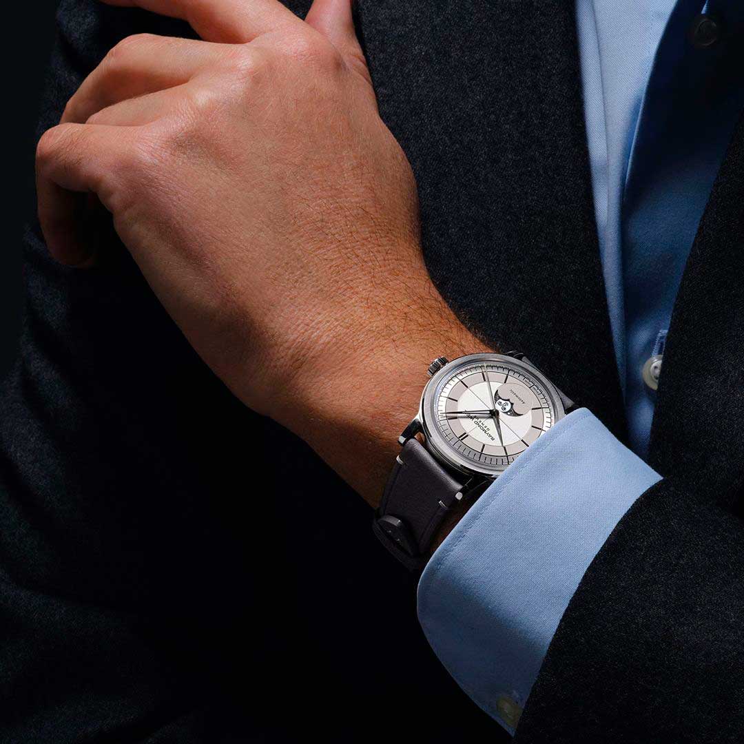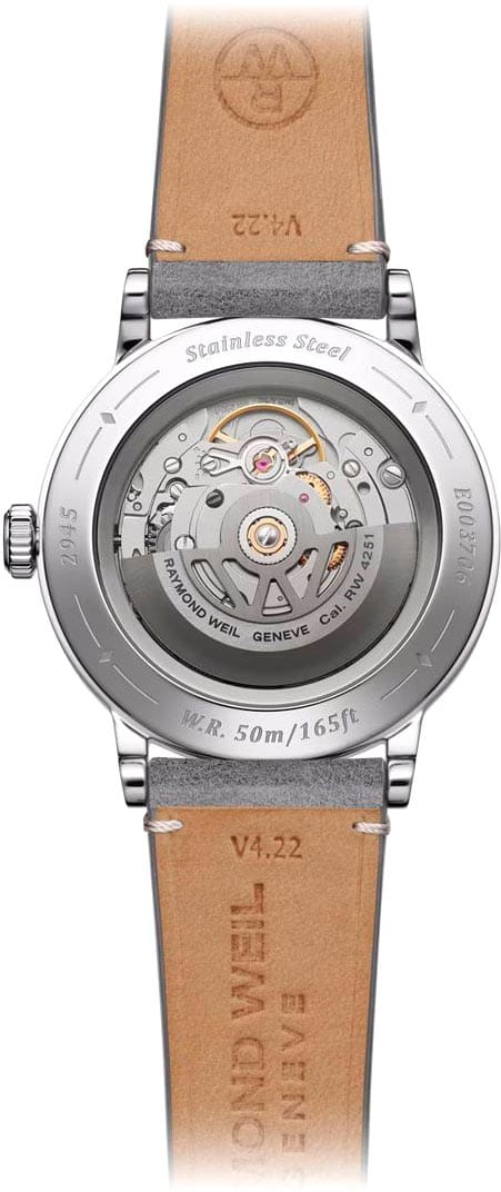 Raymond Weil 2945-STC-65001—мужские швейцарские часы с автоподзаводом Millesime Automatic Moon Phase. Модель оснащена автоматическим механизмом RW4280 с функцией фазы луны и запасом хода 41 час, заключенным в стальной корпус диаметром 39,5 мм с сапфировым стекломСапфировое стеклоПрочный и надёжный материал из кристалла сапфира синтетического происхождения, характеризующийся особой твёрдостью и устойчивостью к царапинам и повреждениям., устойчивым к царапинам и бликам. Матовый циферблат разделен на секторы. Метки и стрелки с люминесцентным покрытиемЛюминесцентное покрытиеПозволяет считывать показания времени в темноте. Производители наносят на стрелки, часовые индексы, безель или поверхность циферблата светонакопительный состав, дающий холодное свечение., которое светится в темноте после непродолжительной зарядки на свету. Серый ремешок из натуральной кожи дополнен с классической застежкой, обеспечивая комфорт и элегантность. Часы обладают водонепроницаемостью до 50 метров, подходят для повседневного использования.