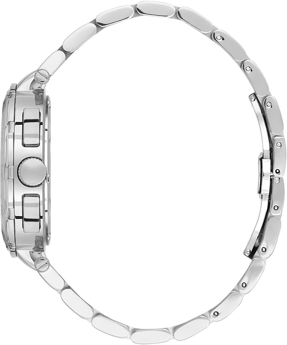 Механизм кварцевый, защищён минеральным стекломМинеральное стеклоМинеральное стекло представляет собой искусственно выращенный минерал кварца. Такое стекло отличается особой устойчивостью к повреждениям и царапинам. Уступает по некоторым качествам сапфировому стеклу.. Конструкция браслета удобна в носке и фиксируется надёжной застёжкой. Эта модель подойдёт мужчине, который ценит сочетание спортивной функциональности и элегантного стиля.