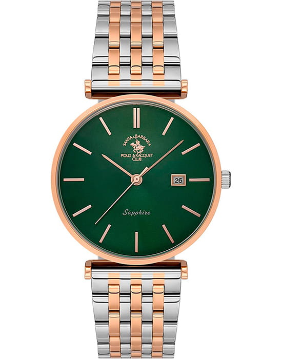 Santa Barbara Polo & Racquet Club — мужские наручные часы в элегантном минималистичном стиле, подчёркивающем статус и изысканность владельца. Корпус изготовлен из нержавеющей стали с прочным PVDPVDУльтратонкое покрытие наносится в технике вакуумного напыления, сочетает в себе нитрид титана особой прочности со слоем золота или оксида хрома. Несёт в себе декоративную или защитную функцию.-покрытием розового золота, которое придаёт часам благородный оттенок и дополнительную стойкость к износу.