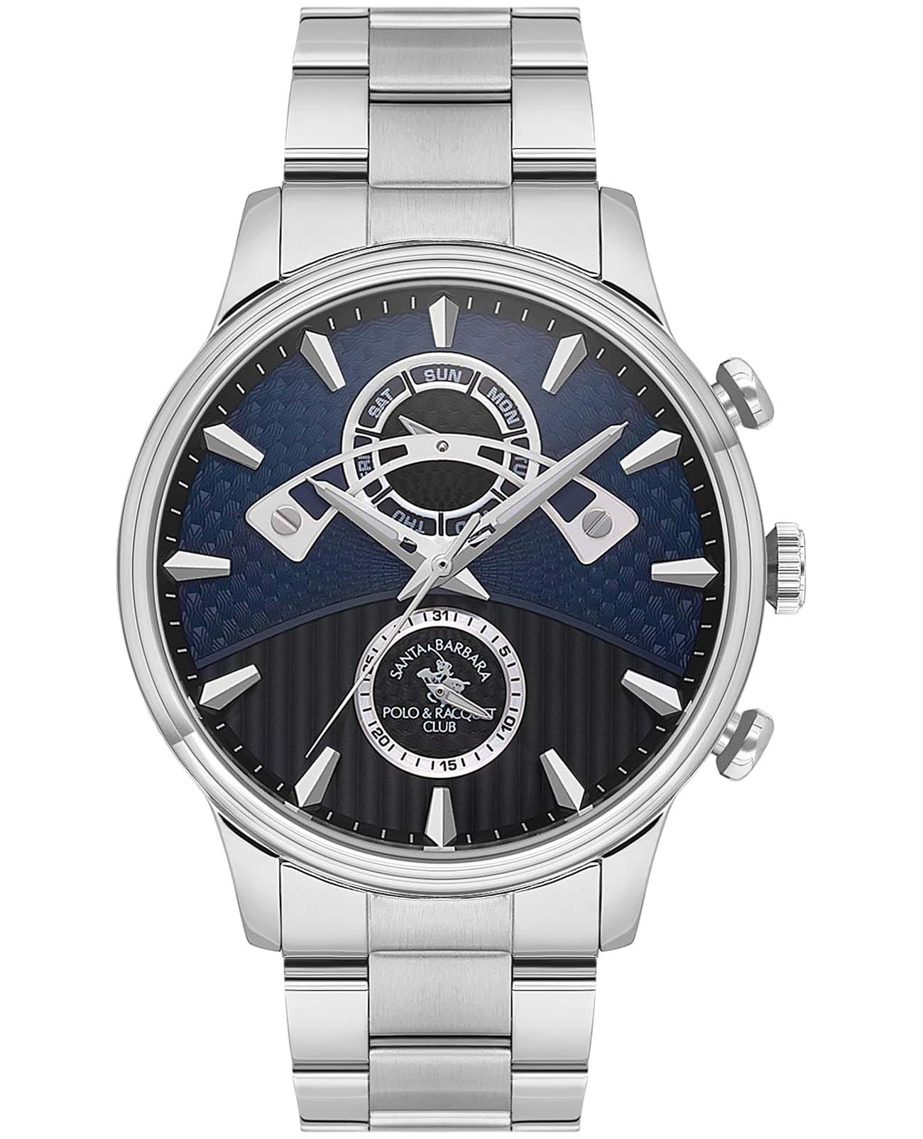 Мужские кварцевые часы Santa Barbara Polo & Racquet Club SB.1.10592-2 — воплощение элегантности и технического совершенства. Корпус из нержавеющей стали серебристого цвета, диаметром 45 мм, что делает их устойчивыми к внешним воздействиям и придает благородный вид. Стрелки с люминесцентным покрытиемЛюминесцентное покрытиеПозволяет считывать показания времени в темноте. Производители наносят на стрелки, часовые индексы, безель или поверхность циферблата светонакопительный состав, дающий холодное свечение., обеспечивающим хорошую читаемость в темноте. Циферблат защищён минеральным стекломМинеральное стеклоМинеральное стекло представляет собой искусственно выращенный минерал кварца. Такое стекло отличается особой устойчивостью к повреждениям и царапинам. Уступает по некоторым качествам сапфировому стеклу. устойчивое к царапинам и механическим повреждениям. Циферблат разделен на две фактурные части и украшен фирменным логотипом. Дата и день недели вынесены на отдельные циферблаты. Стальной браслет на раскладной застёжкеРаскладная застёжкаТакой тип застёжки используется только на браслетах из металла. Она никогда не раскрывается полностью, происходит разделение на 2 и более частей. Раскладывающая застёжка снизит вероятность потери часов к минимуму. обеспечивает комфортное и безопасное ношение. Водонепроницаемость 50 метров позволит защитить корпус от случайных брызг или капель дождя. Идеальный выбор для тех, кто ценит элегантный дизайн и качество.