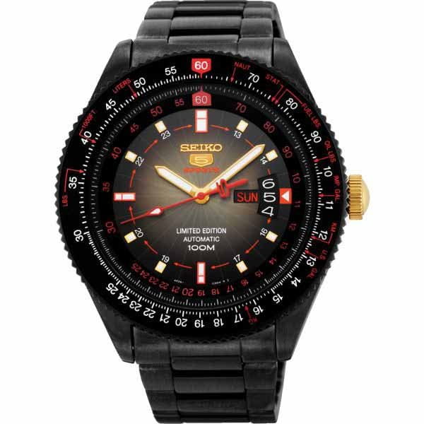 Мужские механические наручные часы с автоподзаводом и возможностью ручного завода Seiko SRP645K1 Limited Edition коллекции Seiko 5 Sports. Калибр механизма — 4R36. Запас хода более 40-ка часов. 21 600 полуколебаний в час. Количество камней - 24. На данной модели отображается дата и день недели. Функция стоп-секунда (остановка секундной стрелки для установки точного времени). Стрелки и метки покрыты люминесцентным напылением LumiBright (светятся в темноте). На корпус и браслет данной модели нанесено стойкое PVD покрытие. Вращающийся безель с логарифмической шкалой. Прозрачная завинчивающаяся задняя крышка. Водонепроницаемость WR100 (10 атм).