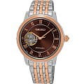 Наручные японские женские часы. Механизм с автоподзаводом, калибр Seiko 4R38. Круглый корпус и браслет часов выполнены из стали с частичным PVD покрытием розового цвета. Шоколадный фон циферблата и золотые элементы дизайна. Водонепроницаемость 10 ATM. Сапфировое стекло, устойчивое к появлению царапин. Современный и роскошный аксессуар.