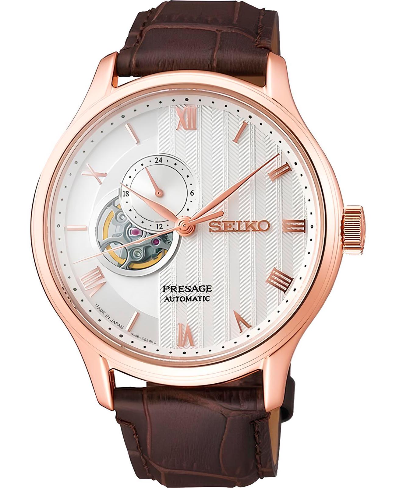 Модель Seiko SARY154 из коллекции Presage Japanese Garden — это элегантные автоматические часы, вдохновлённые эстетикой японских садов и философией дзен. Корпус диаметром 41,8 мм выполнен из нержавеющей стали и PVD-покрытиемPVDУльтратонкое покрытие наносится в технике вакуумного напыления, сочетает в себе нитрид титана особой прочности со слоем золота или оксида хрома. Несёт в себе декоративную или защитную функцию. с комбинированной полировкой и прозрачной задней крышкой. Водозащита составляет 30 метров — оптимально для повседневной носки. Фиксированный стальной безельБезельВнешний ободок, закрепляющий стекло. В спортивных часах так называется поворотное кольцо с делениями на циферблате, выполняет роль таймера – замеряет отрезки времени на шкале. Неподвижный безель – элемент декора. Однонаправленно вращающийся безель на дайверских часах позволяет фиксировать моменты погружения и выныривания на поверхность. подчёркивает гармоничные формы корпуса. Циферблат насыщенного цвета с тонкой текстурой напоминает волны гравия в японском саду. Открытое окно «open heart» на 9 часах позволяет наблюдать за работой механизма. В верхней части расположен индикатор запаса ходаШагомерШагоме́р или педо́метр — измерительный прибор для подсчёта количества сделанных шагов (или пар шагов) при ходьбе или беге.. Циферблат защищён двойным выпуклым сапфировым стекломСапфировое стеклоПрочный и надёжный материал из кристалла сапфира синтетического происхождения, характеризующийся особой твёрдостью и устойчивостью к царапинам и повреждениям. с внутренним антибликовым покрытиемАнтибликовое покрытиеСлой оксида металла в 0,13-0,3 микрон, благодаря которому стекло часов не бликует и не отражает свет. Антибликовое покрытие уменьшает отражение света в 10 раз, обеспечивая отличную читаемость показателей циферблата., устойчивым к царапинам и бликам. Внутри установлен автоматический калибр Seiko 4R39 с ручным подзаводом, функцией остановки секундной стрелки и запасом хода до 41 часа. Кожаный ремешок с раскладной застёжкойРаскладная застёжкаТакой тип застёжки используется только на браслетах из металла. Она никогда не раскрывается полностью, происходит разделение на 2 и более частей. Раскладывающая застёжка снизит вероятность потери часов к минимуму.. Seiko — это стильное и сбалансированное решение для ценителей классики с японским характером, где сочетаются глубокий дизайн и надёжная механика.