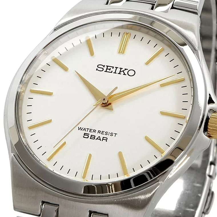 Мужские кварцевые часы Seiko — это надёжный и универсальный аксессуар. Корпус диаметром 34 мм выполнен из нержавеющей стали 316L. Циферблат оформлен индексами и стрелками, включая центральную секундную стрелку. Циферблат защищён прочным закалённым минеральным стеклом Hardlex минеральным стекломМинеральное стеклоМинеральное стекло представляет собой искусственно выращенный минерал кварца. Такое стекло отличается особой устойчивостью к повреждениям и царапинам. Уступает по некоторым качествам сапфировому стеклу.. Механизм — калибр 7N01 с высокой точностью хода (±10–15 сек. в месяц). Часы оснащены стальным браслетом на тройной раскладной застёжкеРаскладная застёжкаТакой тип застёжки используется только на браслетах из металла. Она никогда не раскрывается полностью, происходит разделение на 2 и более частей. Раскладывающая застёжка снизит вероятность потери часов к минимуму. с фиксатором. Водонепроницаемость 50 м позволяет использовать часы в повседневных условиях. Идеальный выбор для тех, кто ценит японское качество и классический дизайн.
