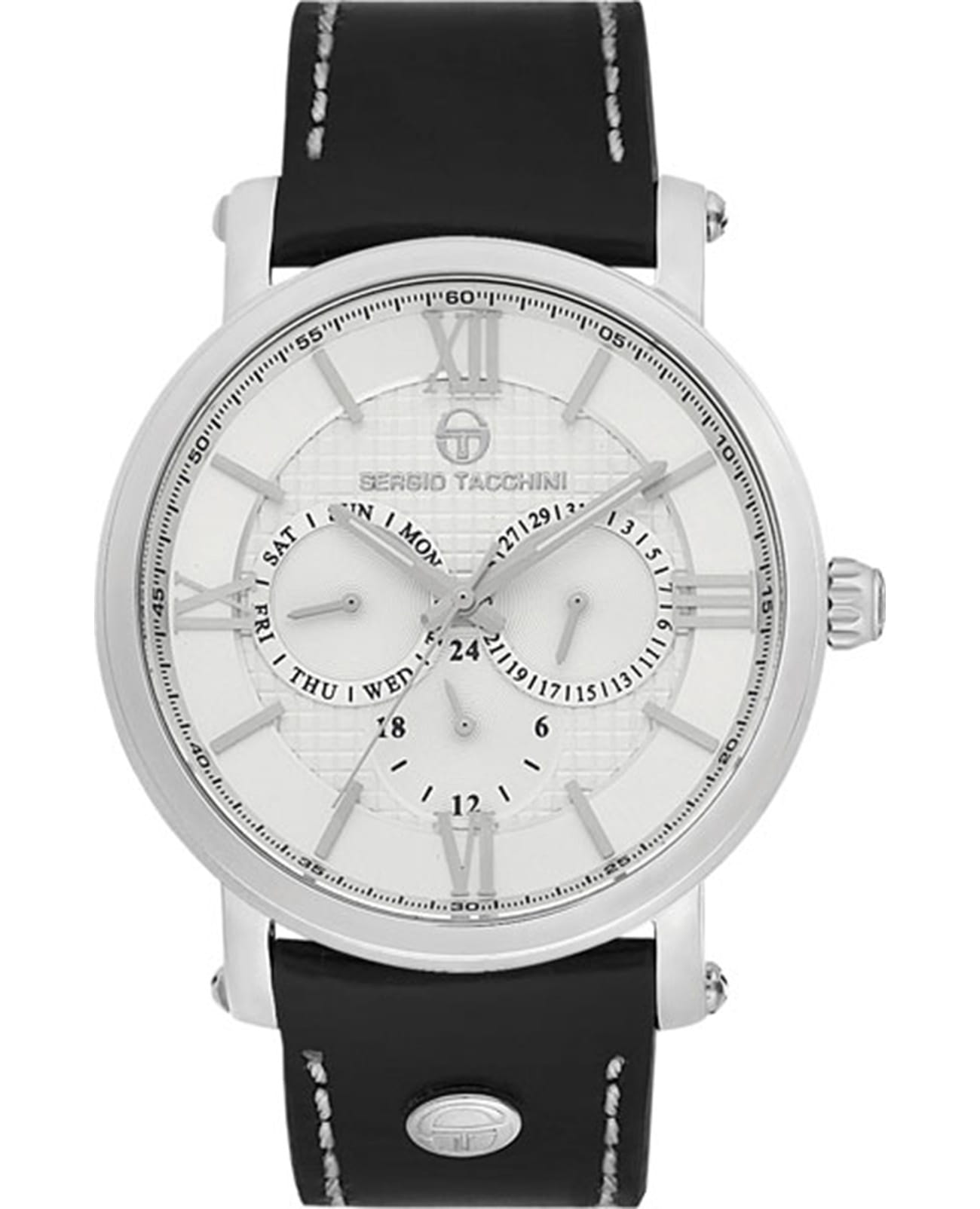 Мужские кварцевые часы Sergio Tacchini из коллекции City — это стильный аксессуар с классическими чертами для уверенного покорения городской жизни. Корпус диаметром 46 мм выполнен из нержавеющей стали 316L. Циферблат серебристого цвета оформлен индексами и стрелками. Указатели дня недели и даты вынесены на отдельные субциферблаты, также присутствует индикация 24-часового формата времени. Циферблат защищён минеральным стекломМинеральное стеклоМинеральное стекло представляет собой искусственно выращенный минерал кварца. Такое стекло отличается особой устойчивостью к повреждениям и царапинам. Уступает по некоторым качествам сапфировому стеклу. с антибликовым покрытиемАнтибликовое покрытиеСлой оксида металла в 0,13-0,3 микрон, благодаря которому стекло часов не бликует и не отражает свет. Антибликовое покрытие уменьшает отражение света в 10 раз, обеспечивая отличную читаемость показателей циферблата.. Механизм — японский кварцевый калибр Miyota 6P29. Часы оснащены кожаным ремешком чёрного цвета с стандартной. Водонепроницаемость 100 м позволяет использовать часы в повседневных условиях и для плавания. Идеальный выбор для тех, кто ценит функциональность и элегантный дизайн.