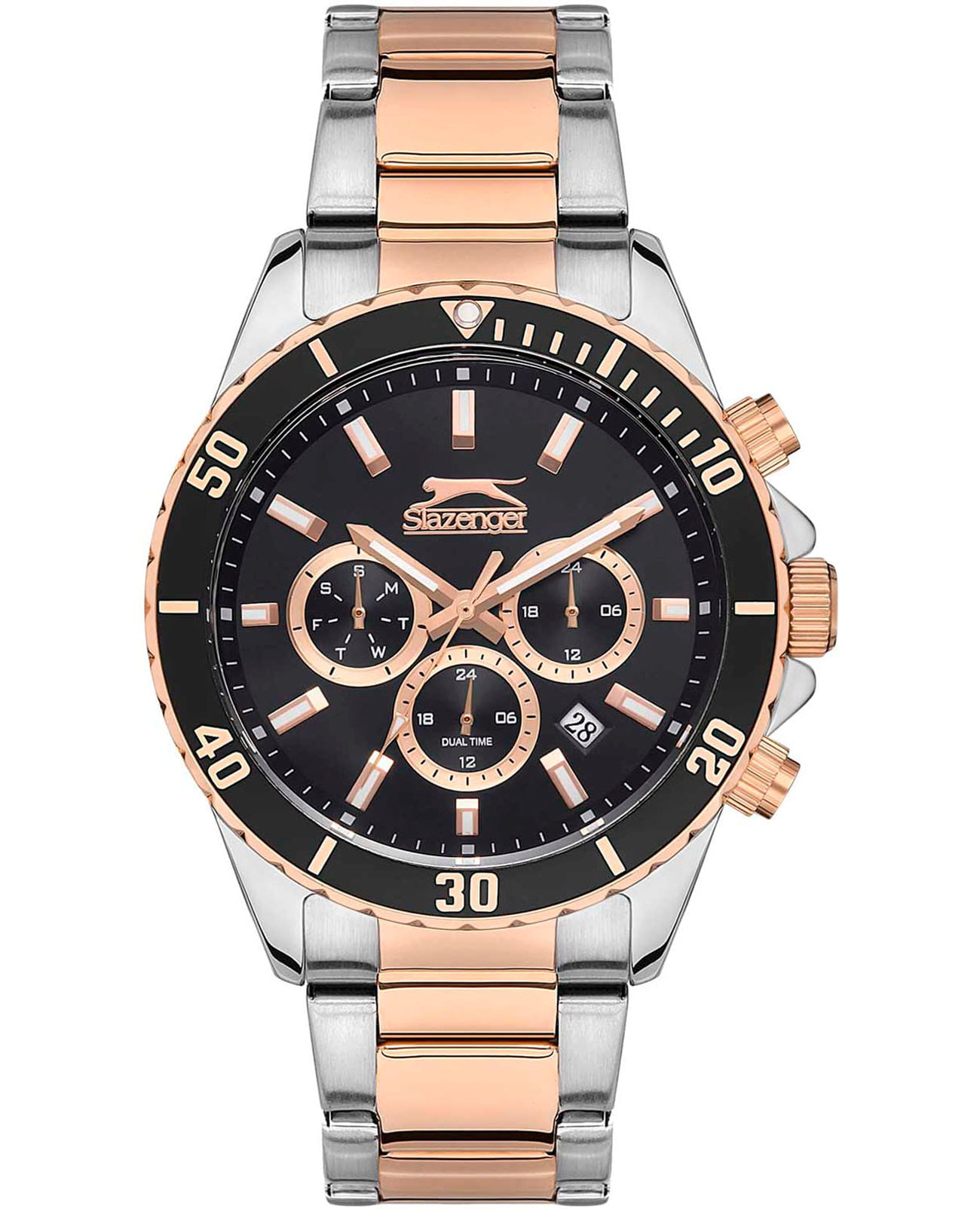 Мужские наручные часы Slazenger SL.09.2091.2.05 сочетают в себе классический дизайн и современные технологии. Модель обладает круглым корпусом диаметром 44 мм из суперметалла, поворотный безельБезельВнешний ободок, закрепляющий стекло. В спортивных часах так называется поворотное кольцо с делениями на циферблате, выполняет роль таймера – замеряет отрезки времени на шкале. Неподвижный безель – элемент декора. Однонаправленно вращающийся безель на дайверских часах позволяет фиксировать моменты погружения и выныривания на поверхность. с IP-покрытиемIP-покрытиеМетод ионного напыления. Демонстрирует повышенную устойчивость к истиранию, окислению и химическим веществам. Под воздействием высокого давления и температуры около 1500°C молекулы металла надёжно соединяются с частицами корпуса часов., что обеспечивает устойчивость к царапинам и коррозии. Браслет изготовлен из нержавеющей стали с частичным IP-покрытиемIP-покрытиеМетод ионного напыления. Демонстрирует повышенную устойчивость к истиранию, окислению и химическим веществам. Под воздействием высокого давления и температуры около 1500°C молекулы металла надёжно соединяются с частицами корпуса часов. на раскладной застежкеРаскладной замокДанный вариант застежки используется только на часах с металлическим браслетом. Отличительная особенность такого крепления в том, что длина браслета становится универсальной и вы можете самостоятельно отрегулировать нужный вам размер – застежка просто двигается по браслету часов., гарантирующей удобство и надежность при ношении. Циферблат черного цвета украшен стрелками с люминесцентным покрытиемЛюминесцентное покрытиеПозволяет считывать показания времени в темноте. Производители наносят на стрелки, часовые индексы, безель или поверхность циферблата светонакопительный состав, дающий холодное свечение., что обеспечивает читаемость времени даже в условиях слабого освещения. Для защиты циферблата используется минеральное стеклоМинеральное стеклоМинеральное стекло представляет собой искусственно выращенный минерал кварца. Такое стекло отличается особой устойчивостью к повреждениям и царапинам. Уступает по некоторым качествам сапфировому стеклу., устойчивое к царапинам и повреждениям. Часы оснащены кварцевым механизмом Miyota, обеспечивающим точность хода с погрешностью не более ±15 секунд в месяц. Модель также включает функции отображения даты, дня недели и второго часового поясаВторой часовой поясФункция, позволяющая отображать время двух часовых поясов одновременно., что делает ее практичной для повседневного использования. Водонепроницаемость часов составляет 5 атмосфер (50 метров), что позволяет использовать их при плавании, но не рекомендуется для дайвинга. Вес модели — 143 грамма, а производитель предоставляет гарантию сроком 12 месяцев. SL.09.2091.2.05 — это стильный аксессуар, который подчеркнет стиль и практичность в любом образе мужчины.