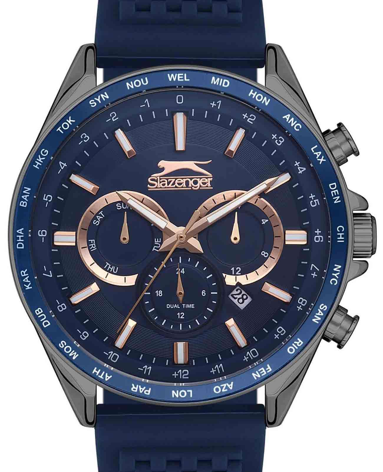 Мужские наручные часы Slazenger SL.09.2179.2.03 — стильный аксессуар с ярко выраженными спортивными чертами, который станет надежным спутником в повседневной жизни. Эти часы оснащены кварцевым механизмом, обеспечивающим высокую точность хода. Металлический корпус с серым IP-покрытиемIP-покрытиеМетод ионного напыления. Демонстрирует повышенную устойчивость к истиранию, окислению и химическим веществам. Под воздействием высокого давления и температуры около 1500°C молекулы металла надёжно соединяются с частицами корпуса часов. в сочетании с синим силиконовый ремешком на классической застежке шириной 22 мм создает гармоничный и современный образ. Диаметр корпуса составляет 45 мм, а толщина — 11 мм, что придает часам стильный и выразительный вид. БезельБезельВнешний ободок, закрепляющий стекло. В спортивных часах так называется поворотное кольцо с делениями на циферблате, выполняет роль таймера – замеряет отрезки времени на шкале. Неподвижный безель – элемент декора. Однонаправленно вращающийся безель на дайверских часах позволяет фиксировать моменты погружения и выныривания на поверхность. с синим IP-покрытиемIP-покрытиеМетод ионного напыления. Демонстрирует повышенную устойчивость к истиранию, окислению и химическим веществам. Под воздействием высокого давления и температуры около 1500°C молекулы металла надёжно соединяются с частицами корпуса часов., что придает ему дополнительную прочность и устойчивость к износу. Минеральное стеклоМинеральное стеклоМинеральное стекло представляет собой искусственно выращенный минерал кварца. Такое стекло отличается особой устойчивостью к повреждениям и царапинам. Уступает по некоторым качествам сапфировому стеклу. защищает циферблат от царапин и внешних воздействий, а водозащита уровня WR 50 позволяет не беспокоиться о случайных контактах с водой, будь то дождь или мытье рук. Особенностью данной модели является наличие календаря, отображающего дату и день недели, а также возможность следить за временем во втором часовом поясе.  Люминесцентное покрытиеЛюминесцентное покрытиеПозволяет считывать показания времени в темноте. Производители наносят на стрелки, часовые индексы, безель или поверхность циферблата светонакопительный состав, дающий холодное свечение. на стрелках и метках обеспечивает отличную видимость в темноте.