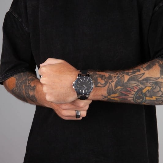 Часы Slazenger SL.09.2219.1.01 представляют собой стильное и функциональное аксессуарное решение для современных мужчин. Этот английский бренд предлагает кварцевый механизм, обеспечивающий точность хода и надежность в использовании. Корпус из металла и минеральное стеклоМинеральное стеклоМинеральное стекло представляет собой искусственно выращенный минерал кварца. Такое стекло отличается особой устойчивостью к повреждениям и царапинам. Уступает по некоторым качествам сапфировому стеклу. придают часам прочность и износостойкость, а водозащита уровня WR 30 позволяет не беспокоиться о случайных брызгах и дождевых каплях. БезельБезельВнешний ободок, закрепляющий стекло. В спортивных часах так называется поворотное кольцо с делениями на циферблате, выполняет роль таймера – замеряет отрезки времени на шкале. Неподвижный безель – элемент декора. Однонаправленно вращающийся безель на дайверских часах позволяет фиксировать моменты погружения и выныривания на поверхность. с черным IP-покрытиемIP-покрытиеМетод ионного напыления. Демонстрирует повышенную устойчивость к истиранию, окислению и химическим веществам. Под воздействием высокого давления и температуры около 1500°C молекулы металла надёжно соединяются с частицами корпуса часов. придаёт аксессуару современный вид и дополнительную прочность. Металлический браслет с комбинированными элементами и черными силиконовыми вставками обеспечивает комфортное ношение и надежную фиксацию на запястье, а раскладная застёжкаРаскладная застёжкаТакой тип застёжки используется только на браслетах из металла. Она никогда не раскрывается полностью, происходит разделение на 2 и более частей. Раскладывающая застёжка снизит вероятность потери часов к минимуму. облегчает процесс надевания. Диаметр корпуса составляет 45 мм, а толщина — 12 мм, что делает модель выразительной и заметной на руке, при этом она сохраняет элегантность и изысканность. На черном циферблате присутствует окошко даты, что добавляет практичности в повседневное использование. Заводная головка оснащена защитой, обеспечивая дополнительную долговечность. Вес часов составляет 148 грамм, что делает их достаточно легкими для комфортного ношения в течение всего дня.
