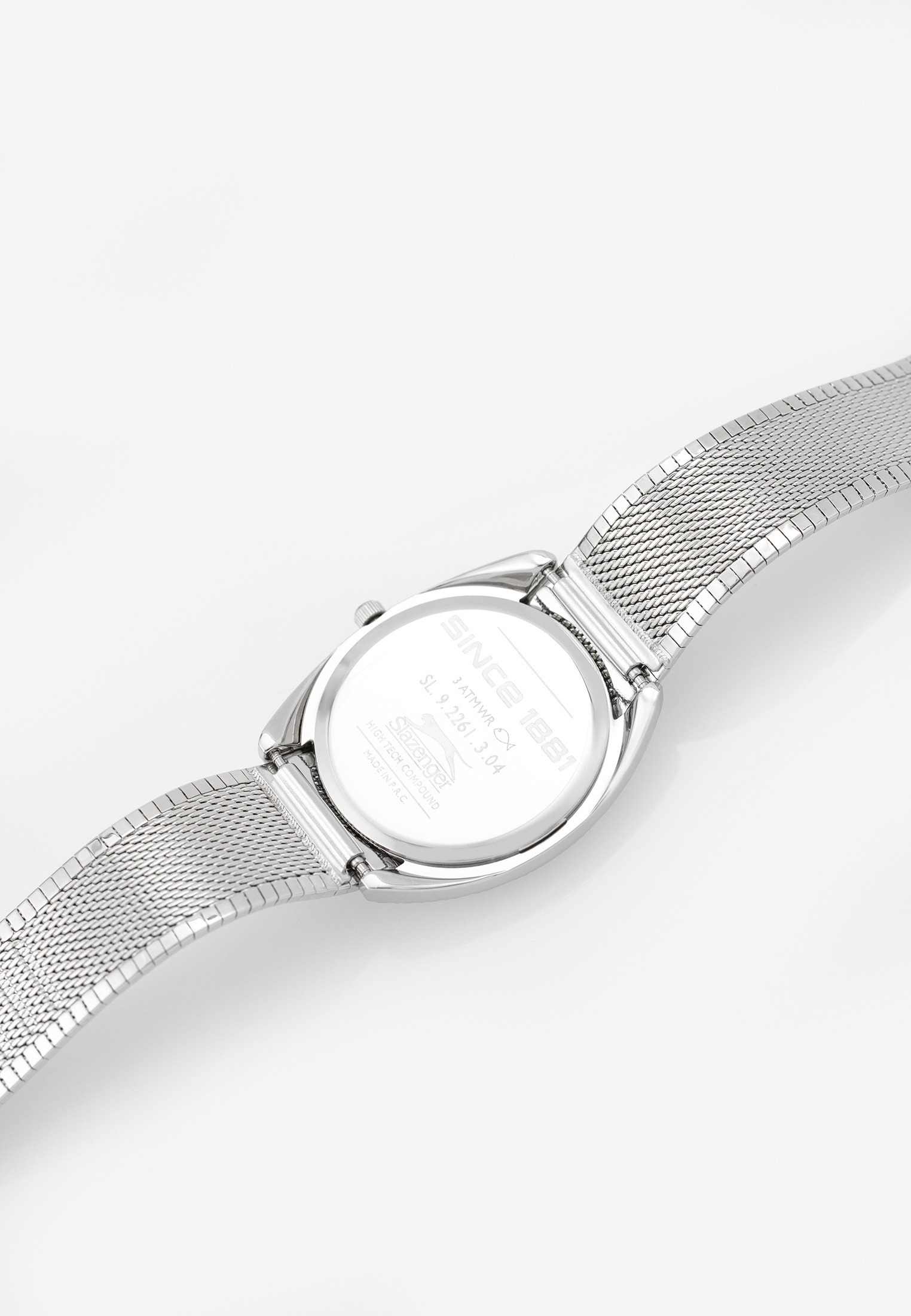 Часы Slazenger SL.09.2261.3.04 — это утонченное сочетание современного дизайна и классической элегантности. Изделие оснащено надежным кварцевым механизмом, который обеспечивает точность хода и простоту эксплуатации. Корпус из суперметалла гармонично сочетается с металлическим браслетом аналогичного оттенка и покрытия, подчеркивая изысканность аксессуара и его актуальность в модных тенденциях. Бирюзовый циферблат украшен изысканным гильоше Clous de Paris и дополнен лаконичными метками в виде штрихов, а также фирменным логотипом бренда. Минеральное стеклоМинеральное стеклоМинеральное стекло представляет собой искусственно выращенный минерал кварца. Такое стекло отличается особой устойчивостью к повреждениям и царапинам. Уступает по некоторым качествам сапфировому стеклу. надежно защищает циферблат от случайных царапин. Диаметр корпуса составляет 34 мм, толщина — 8 мм, ширина браслета — 18 мм, а вес часов — всего 54 г, благодаря чему аксессуар удобно сидит на запястье. Стальной браслет c раскладным замкомРаскладной замокДанный вариант застежки используется только на часах с металлическим браслетом. Отличительная особенность такого крепления в том, что длина браслета становится универсальной и вы можете самостоятельно отрегулировать нужный вам размер – застежка просто двигается по браслету часов. удобно фиксируется на запястье и подчёркивает современный характер часов. Водозащита 30WR позволяет не беспокоиться о случайных брызгах. Модель отличается отсутствием секундной стрелки и оснащена рифленой заводной головкой для легкой корректировки времени. Эти часы станут стильным завершением любого образа, подчеркивая индивидуальность и чувство вкуса обладателя.