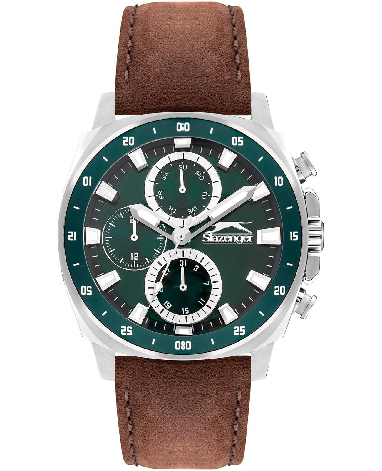 Slazenger SL.09.2293.2.07 — это стильные наручные часы, выполненные в современном дизайне и отлично подходящие для повседневного использования. Корпус диаметром 45 мм изготовлен из прочного металла и дополнен минеральным стекломМинеральное стеклоМинеральное стекло представляет собой искусственно выращенный минерал кварца. Такое стекло отличается особой устойчивостью к повреждениям и царапинам. Уступает по некоторым качествам сапфировому стеклу., которое защищает градиентный коричневый циферблат. Коричневый кожаный ремешок шириной 24 мм оснащён надежной классической застежкой, которая обеспечивает комфортную посадку на руке. Кварцевый механизм гарантирует точный ход, а водозащита уровня WR 50 позволяет не снимать часы во время мытья рук или под дождём. Модель оснащена люминесцентным покрытиемЛюминесцентное покрытиеПозволяет считывать показания времени в темноте. Производители наносят на стрелки, часовые индексы, безель или поверхность циферблата светонакопительный состав, дающий холодное свечение. стрелок и меток, что облегчает считывание времени в темноте. Дополнительные малые циферблаты отображают дату, день недели и текущее время в 24-часовом формате. Часы также оснащены заводной головкой с защитой и безелемБезельВнешний ободок, закрепляющий стекло. В спортивных часах так называется поворотное кольцо с делениями на циферблате, выполняет роль таймера – замеряет отрезки времени на шкале. Неподвижный безель – элемент декора. Однонаправленно вращающийся безель на дайверских часах позволяет фиксировать моменты погружения и выныривания на поверхность. с зелёным IP-покрытиемIP-покрытиеМетод ионного напыления. Демонстрирует повышенную устойчивость к истиранию, окислению и химическим веществам. Под воздействием высокого давления и температуры около 1500°C молекулы металла надёжно соединяются с частицами корпуса часов. и секундной разметкой. Вес изделия составляет 80 грамм.