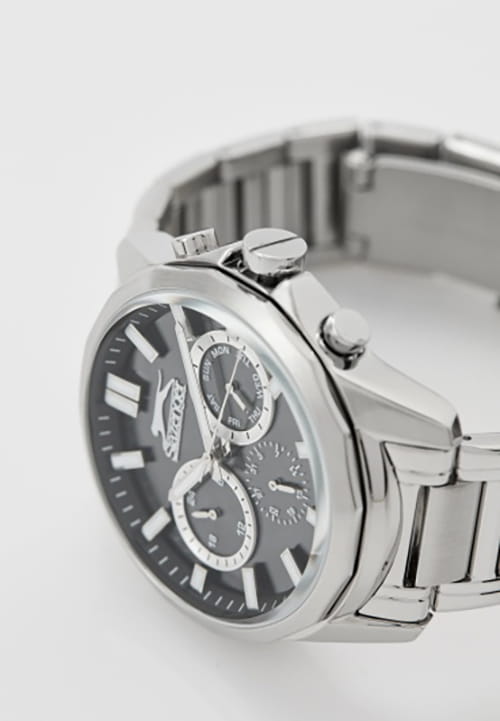 Мужские кварцевые часы Slazenger SL.09.2300.2.01 — это выразительный и функциональный аксессуар, сочетающий прочность, стиль и насыщенную комплектацию. Корпус и браслет выполнены из суперметалла, защищён минеральным стекломМинеральное стеклоМинеральное стекло представляет собой искусственно выращенный минерал кварца. Такое стекло отличается особой устойчивостью к повреждениям и царапинам. Уступает по некоторым качествам сапфировому стеклу.. Циферблат чёрного цвета оформлен с вынесенными малыми циферблатами для индикации дня недели, даты и времени в 24-часовом формате. Заводная головка снабжена защитой, а задняя крышка — завинчивающаяся, что обеспечивает повышенную надёжность конструкции. Стрелки оснащены люминесцентным покрытиемЛюминесцентное покрытиеПозволяет считывать показания времени в темноте. Производители наносят на стрелки, часовые индексы, безель или поверхность циферблата светонакопительный состав, дающий холодное свечение., обеспечивающим хорошую читаемость в темноте. Браслет фиксируется на раскладной застёжкеРаскладная застёжкаТакой тип застёжки используется только на браслетах из металла. Она никогда не раскрывается полностью, происходит разделение на 2 и более частей. Раскладывающая застёжка снизит вероятность потери часов к минимуму., обеспечивая удобство и безопасность ношения. Водонепроницаемость 50 м позволяет использовать часы в повседневных условиях, защищая от случайных брызг и капель дождя. Модель подчёркивает индивидуальность владельца и идеально подходит как для повседневного, так и для делового образа.