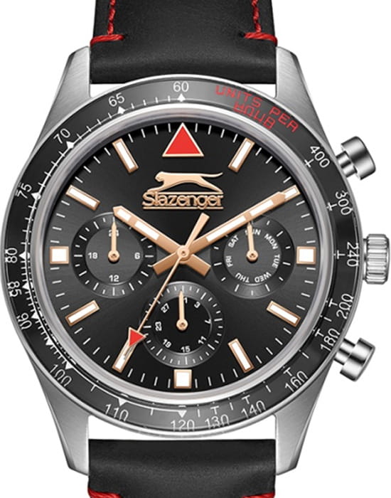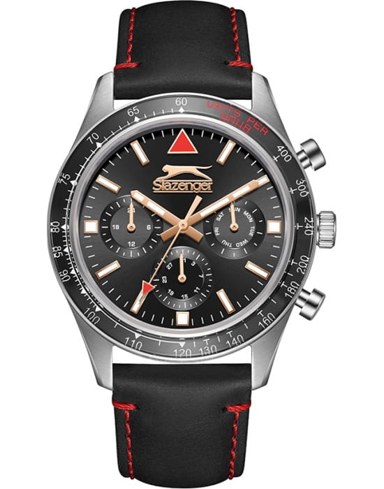 Slazenger SL.09.2361.2.01 — стильные мужские часы, сочетающие современный дизайн и функциональность. Корпус выполнен из суперметалла, а безельБезельВнешний ободок, закрепляющий стекло. В спортивных часах так называется поворотное кольцо с делениями на циферблате, выполняет роль таймера – замеряет отрезки времени на шкале. Неподвижный безель – элемент декора. Однонаправленно вращающийся безель на дайверских часах позволяет фиксировать моменты погружения и выныривания на поверхность. покрыт PVDPVDУльтратонкое покрытие наносится в технике вакуумного напыления, сочетает в себе нитрид титана особой прочности со слоем золота или оксида хрома. Несёт в себе декоративную или защитную функцию.-покрытием черного цвета, придающим модели выразительный и элегантный вид. Минеральное стеклоМинеральное стеклоМинеральное стекло представляет собой искусственно выращенный минерал кварца. Такое стекло отличается особой устойчивостью к повреждениям и царапинам. Уступает по некоторым качествам сапфировому стеклу. защищает циферблат от царапин и гарантирует превосходную читаемость. Черный циферблат с контрастными метками и стрелками обеспечивает отличную читаемость в любых условиях. Кожаный ремешок придаёт модели классический стиль и комфорт при ношении. Функциональность дополняется индикацией даты, дня недели и 24-часовым форматом времени. Водонепроницаемость 50 метров делает модель устойчивой к случайным брызгам, идеально подходя для повседневного использования.