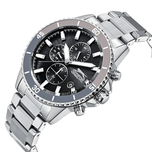 Мужские кварцевые часы Slazenger — это выразительный и функциональный аксессуар. Корпус диаметром 44 мм и толщиной 13 мм выполнен из суперметалла. БезельБезельВнешний ободок, закрепляющий стекло. В спортивных часах так называется поворотное кольцо с делениями на циферблате, выполняет роль таймера – замеряет отрезки времени на шкале. Неподвижный безель – элемент декора. Однонаправленно вращающийся безель на дайверских часах позволяет фиксировать моменты погружения и выныривания на поверхность. из суперметалла с IP-покрытиемIP-покрытиеМетод ионного напыления. Демонстрирует повышенную устойчивость к истиранию, окислению и химическим веществам. Под воздействием высокого давления и температуры около 1500°C молекулы металла надёжно соединяются с частицами корпуса часов.. Циферблат чёрного цвета оформлен индексами и стрелками. Циферблат защищён минеральным стекломМинеральное стеклоМинеральное стекло представляет собой искусственно выращенный минерал кварца. Такое стекло отличается особой устойчивостью к повреждениям и царапинам. Уступает по некоторым качествам сапфировому стеклу.. Механизм — кварцевый калибр. Часы оснащены индикацией дня недели, даты и 12/24-часового формата времени. Окошко даты расположено между 4 и 5 часами. Часы оснащены браслетом из суперметалла с раскладной застёжкойРаскладная застёжкаТакой тип застёжки используется только на браслетах из металла. Она никогда не раскрывается полностью, происходит разделение на 2 и более частей. Раскладывающая застёжка снизит вероятность потери часов к минимуму.. Водонепроницаемость 100 м позволяет использовать часы для плавания и повседневного ношения. Гарантия — 12 месяцев. Идеальный выбор для тех, кто ценит стиль, функциональность и качество.