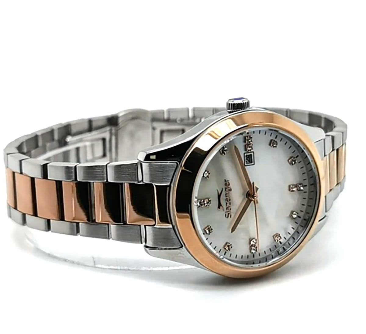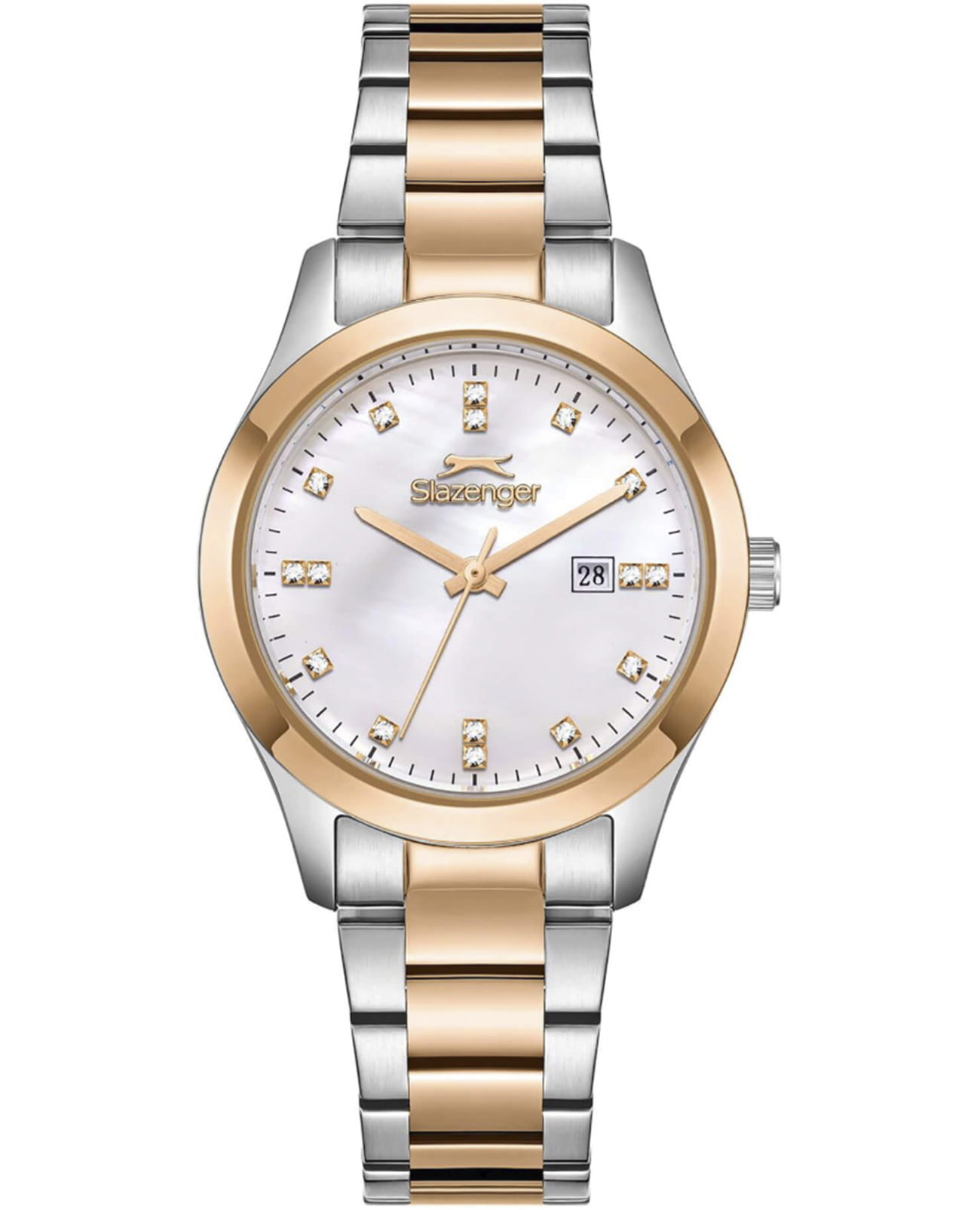 Женские кварцевые часы Slazenger — это элегантный аксессуар. Корпус диаметром 32 мм и толщиной 10 мм выполнен из нержавеющей стали 316L. БезельБезельВнешний ободок, закрепляющий стекло. В спортивных часах так называется поворотное кольцо с делениями на циферблате, выполняет роль таймера – замеряет отрезки времени на шкале. Неподвижный безель – элемент декора. Однонаправленно вращающийся безель на дайверских часах позволяет фиксировать моменты погружения и выныривания на поверхность. с IP-покрытиемIP-покрытиеМетод ионного напыления. Демонстрирует повышенную устойчивость к истиранию, окислению и химическим веществам. Под воздействием высокого давления и температуры около 1500°C молекулы металла надёжно соединяются с частицами корпуса часов.. Циферблат белого цвета с перламутровыми вставками оформлен индексами в виде фианитов. Циферблат защищён минеральным стекломМинеральное стеклоМинеральное стекло представляет собой искусственно выращенный минерал кварца. Такое стекло отличается особой устойчивостью к повреждениям и царапинам. Уступает по некоторым качествам сапфировому стеклу.. Механизм — кварцевый. Окошко даты расположено в положении 3 часов. Часы оснащены стальным браслетом с IP-покрытиемIP-покрытиеМетод ионного напыления. Демонстрирует повышенную устойчивость к истиранию, окислению и химическим веществам. Под воздействием высокого давления и температуры около 1500°C молекулы металла надёжно соединяются с частицами корпуса часов. и раскладной застёжкойРаскладная застёжкаТакой тип застёжки используется только на браслетах из металла. Она никогда не раскрывается полностью, происходит разделение на 2 и более частей. Раскладывающая застёжка снизит вероятность потери часов к минимуму.. Водонепроницаемость 50 м позволяет использовать часы в повседневных условиях. Гарантия — 12 месяцев. Идеальный выбор для тех, кто ценит стиль и качество.