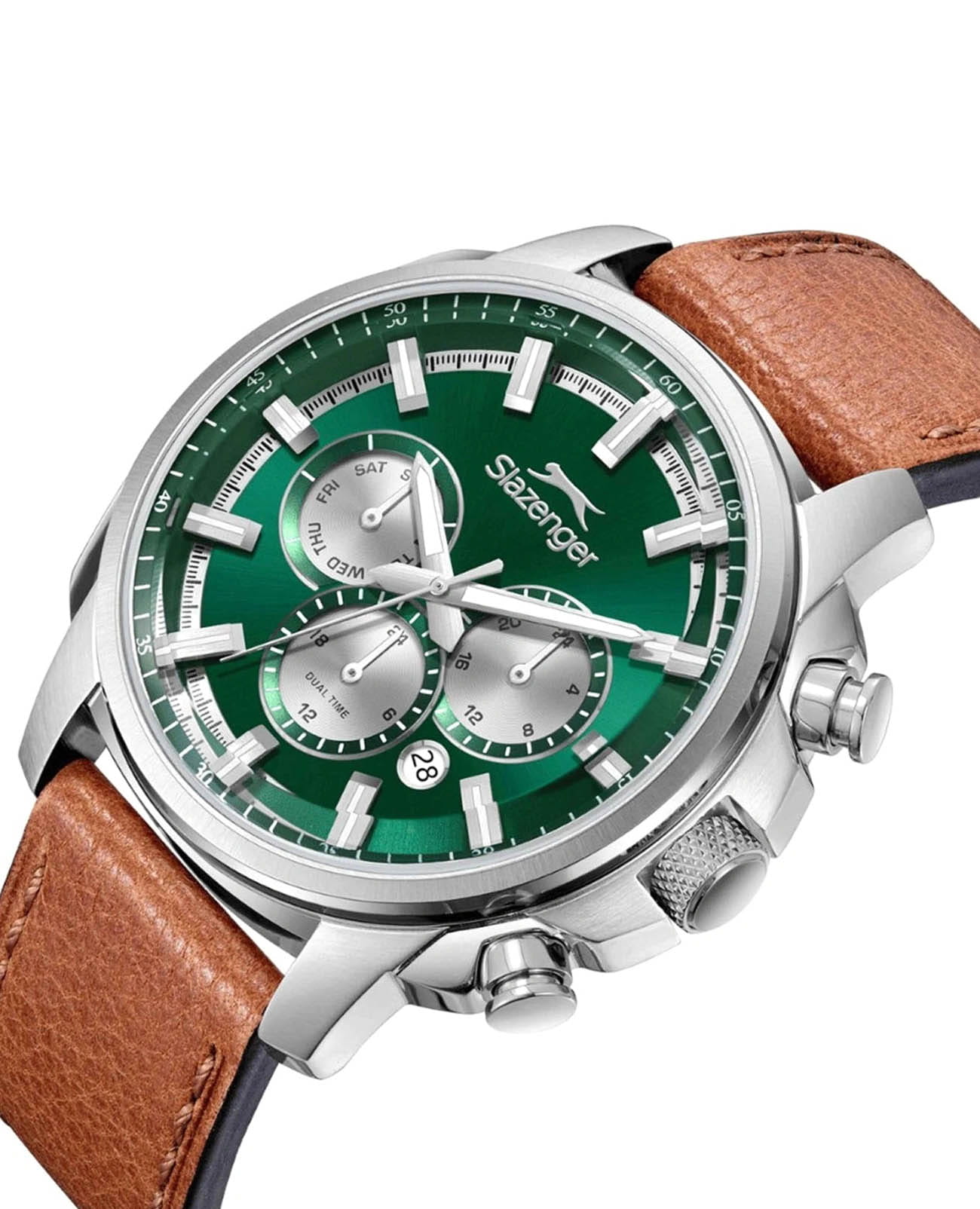Мужские кварцевые часы Slazenger — это выразительный и функциональный аксессуар. Корпус диаметром 43 мм и толщиной 14 мм выполнен из нержавеющей стали 316L. Циферблат зелёного цвета оформлен индексами и стрелками. Циферблат защищён минеральным стекломМинеральное стеклоМинеральное стекло представляет собой искусственно выращенный минерал кварца. Такое стекло отличается особой устойчивостью к повреждениям и царапинам. Уступает по некоторым качествам сапфировому стеклу.. Механизм — кварцевый. Часы оснащены индикацией дня недели, даты, 12/24-часового формата времени и функцией второго часового пояса (GMT)Второй часовой поясФункция, позволяющая отображать время двух часовых поясов одновременно.. Окошко даты расположено между 4 и 5 часами. Часы оснащены кожаным ремешком со стандартной застёжкой. Водонепроницаемость 100 м позволяет использовать часы для плавания и повседневного ношения. Гарантия — 12 месяцев. Идеальный выбор для тех, кто ценит стиль, функциональность и качество.