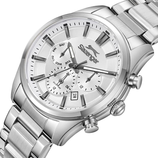 Мужские кварцевые часы Slazenger — это выразительный и функциональный аксессуар. Корпус диаметром 43 мм и толщиной 12 мм выполнен из нержавеющей стали 316L. Циферблат серебристого цвета оформлен индексами и стрелками с люминесцентным покрытиемЛюминесцентное покрытиеПозволяет считывать показания времени в темноте. Производители наносят на стрелки, часовые индексы, безель или поверхность циферблата светонакопительный состав, дающий холодное свечение., обеспечивающим хорошую читаемость в темноте. Циферблат защищён минеральным стекломМинеральное стеклоМинеральное стекло представляет собой искусственно выращенный минерал кварца. Такое стекло отличается особой устойчивостью к повреждениям и царапинам. Уступает по некоторым качествам сапфировому стеклу.. Механизм — кварцевый калибр JP25. Часы оснащены индикацией дня недели, даты, 12/24-часового формата времени и функцией второго часового пояса (GMT)Второй часовой поясФункция, позволяющая отображать время двух часовых поясов одновременно.. Окошко даты расположено между 4 и 5 часами. Часы оснащены стальным браслетом из нержавеющей стали 316L с раскладной застёжкойРаскладная застёжкаТакой тип застёжки используется только на браслетах из металла. Она никогда не раскрывается полностью, происходит разделение на 2 и более частей. Раскладывающая застёжка снизит вероятность потери часов к минимуму.. Водонепроницаемость 100 м позволяет использовать часы для плавания и повседневного ношения. Гарантия — 12 месяцев. Идеальный выбор для тех, кто ценит стиль, функциональность и качество.