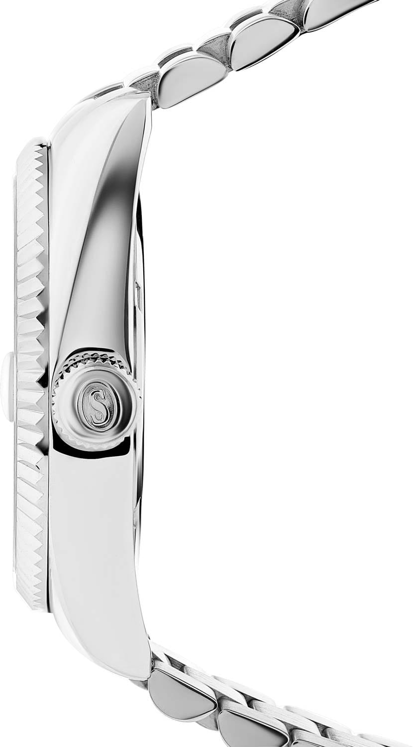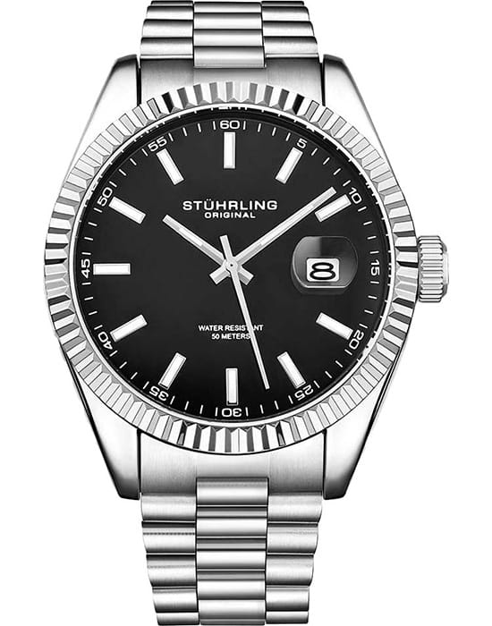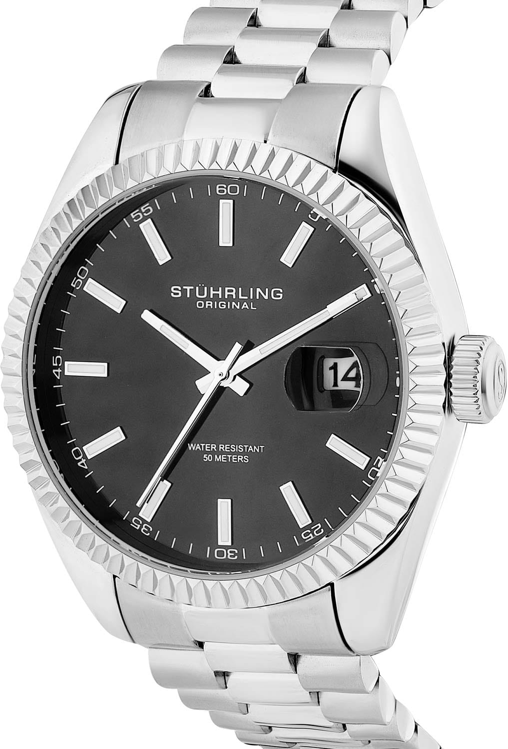 Stuhrling 3935.3 — элегантные мужские часы, объединяющие строгую классику и современную функциональность. Корпус из нержавеющей стали создают ощущение монолитной надёжности, а глубокий циферблат придаёт модели выразительность и характер. Стальной браслет на раскладной застёжкеРаскладная застёжкаТакой тип застёжки используется только на браслетах из металла. Она никогда не раскрывается полностью, происходит разделение на 2 и более частей. Раскладывающая застёжка снизит вероятность потери часов к минимуму. обеспечивает комфорт. Крупные метки и стрелки с люминесцентным покрытиемЛюминесцентное покрытиеПозволяет считывать показания времени в темноте. Производители наносят на стрелки, часовые индексы, безель или поверхность циферблата светонакопительный состав, дающий холодное свечение. обеспечивают идеальную читаемость даже в темноте. На позиции «3 часов» расположено аккуратное окно даты, подчёркивающее симметрию дизайна. Прочное стекло Krysterna защищает циферблат от царапин, а надёжный кварцевый механизм гарантирует стабильную точность. Stuhrling — выбор уверенного мужчины, ценящего сочетание функциональности, лаконичного дизайна и безупречной отделки.