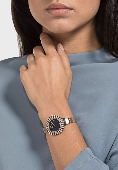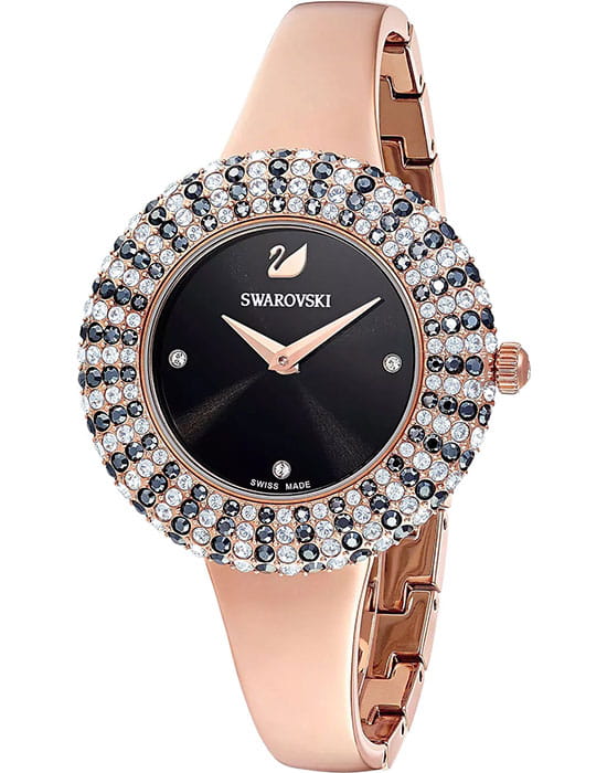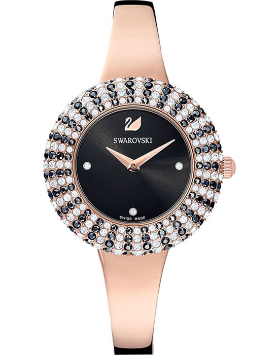 Женские часы Swarovski Crystal Rose 5484050 – это элегантные и утончённые часы, отличающиеся непревзойдённым сиянием.  БезельБезельВнешний ободок, закрепляющий стекло. В спортивных часах так называется поворотное кольцо с делениями на циферблате, выполняет роль таймера – замеряет отрезки времени на шкале. Неподвижный безель – элемент декора. Однонаправленно вращающийся безель на дайверских часах позволяет фиксировать моменты погружения и выныривания на поверхность. украшен микропаве из 215 кристаллов. Завершающие штрихи уникального дизайна – корпус и браслет из нержавеющей стали с PVDPVDУльтратонкое покрытие наносится в технике вакуумного напыления, сочетает в себе нитрид титана особой прочности со слоем золота или оксида хрома. Несёт в себе декоративную или защитную функцию. покрытием оттенка розового золота и черный циферблат с рисунком в виде солнечных лучей и тремя метками из прозрачных кристаллов. Надежное минеральное стеклоМинеральное стеклоМинеральное стекло представляет собой искусственно выращенный минерал кварца. Такое стекло отличается особой устойчивостью к повреждениям и царапинам. Уступает по некоторым качествам сапфировому стеклу. защищает часы от царапин и долго сохраняет первоначальный внешний вид. Водозащита 50 метров делает часы практичными для повседневного использования.