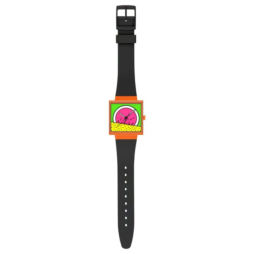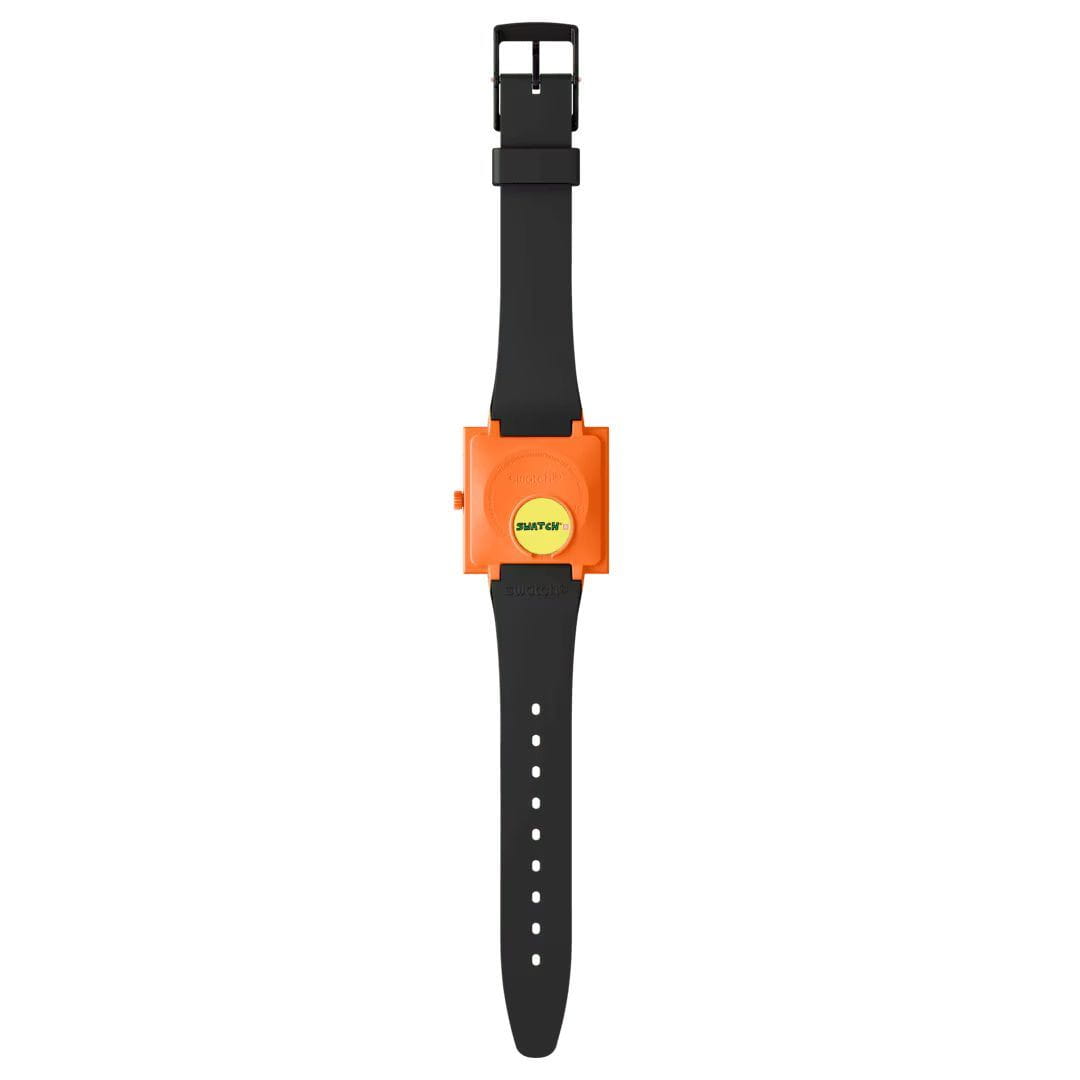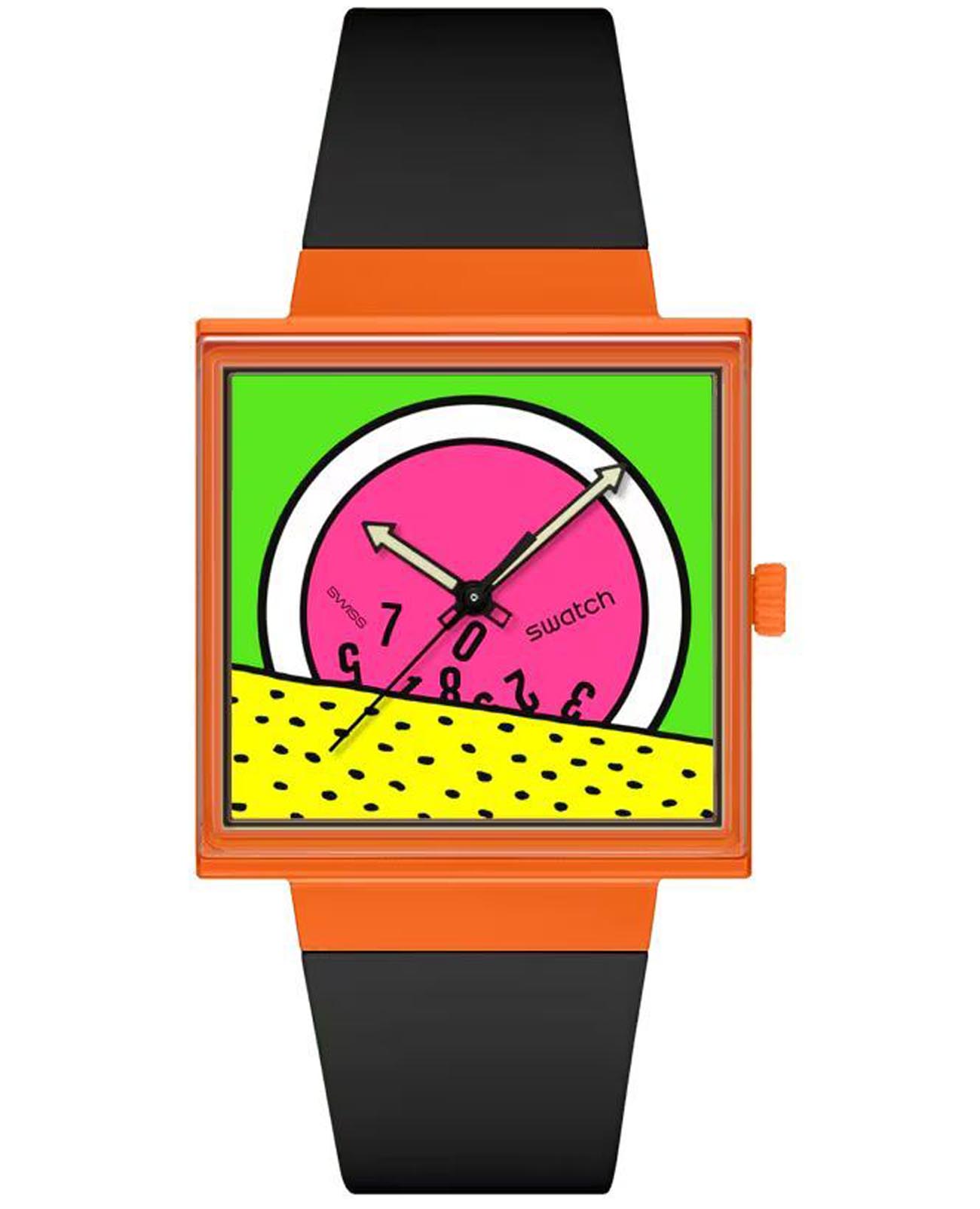 Swatch Square Bioceramic Standard SO34Z101 "BREAK TIME" - это оригинальные квадратные часы с корпусом 41,8*41,8 мм из многоцветной биокерамики. Модель оснащена кварцевым механизмом, окошком даты и дня недели, водонепроницаемостью до 20 метров. Часы имеют черный матовый ремешок из биоматериала, оранжевый корпус и стекло из биоматериала. Черные стрелки с люминесцентным покрытиемЛюминесцентное покрытиеПозволяет считывать показания времени в темноте. Производители наносят на стрелки, часовые индексы, безель или поверхность циферблата светонакопительный состав, дающий холодное свечение.. Эта экологичная модель унисекс сочетает инновационные материалы с ярким дизайном, вдохновленным оригинальным Swatch 1983 года, и подходит для тех, кто ценит минимализм и заботу об окружающей среде.