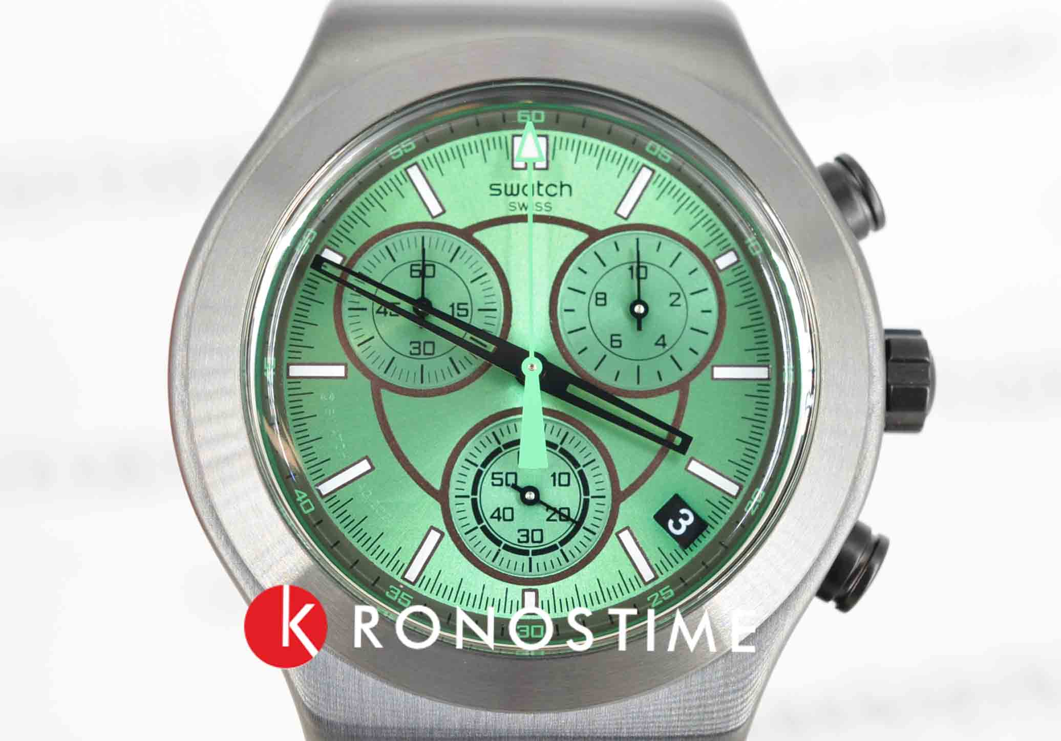 Часы Swatch YVM407G — это стильный и современный аксессуар для тех, кто ценит лёгкость и комфорт. Этот стильный хронографХронографФункция позволяет измерять отрезки времени с особой точностью: часы, минуты, секунды. Верным признаком хронографа является наличие на циферблате 3 дополнительных окошек-счётчиков. оснащен зеленым циферблатом с радиальной полировкой, черными часовой и минутной стрелками-скелетонами. Кончик зеленой секундной стрелки хронографа светится в темноте благодаря люминесцентному покрытиюЛюминесцентное покрытиеПозволяет считывать показания времени в темноте. Производители наносят на стрелки, часовые индексы, безель или поверхность циферблата светонакопительный состав, дающий холодное свечение.. Стрелки мини-циферблатов черные. На внешнее кольцо темно-серой расцветки нанесен черно-зеленый принт с минутной шкалой. Часовые индексы светятся в темноте благодаря люминесцентному покрытиюЛюминесцентное покрытиеПозволяет считывать показания времени в темноте. Производители наносят на стрелки, часовые индексы, безель или поверхность циферблата светонакопительный состав, дающий холодное свечение., а между отметками 4 и 5 часов расположено черное окошко календаря с белым принтом. Матированный корпус, безельБезельВнешний ободок, закрепляющий стекло. В спортивных часах так называется поворотное кольцо с делениями на циферблате, выполняет роль таймера – замеряет отрезки времени на шкале. Неподвижный безель – элемент декора. Однонаправленно вращающийся безель на дайверских часах позволяет фиксировать моменты погружения и выныривания на поверхность., пушеры и браслет с застёжкой «бабочка»Застёжка "бабочка"Такой вид застёжки дополняется предохранителями, помогающими избежать случайного раскрытия браслета. Обладают изящным исполнением. выполнены из нержавеющей стали с черным PVDPVDУльтратонкое покрытие наносится в технике вакуумного напыления, сочетает в себе нитрид титана особой прочности со слоем золота или оксида хрома. Несёт в себе декоративную или защитную функцию. покрытием. Водозащита 30 метров делает часы практичными для повседневного использования. Эти часы подойдут для повседневного ношения и станут ярким акцентом в вашем наряде.