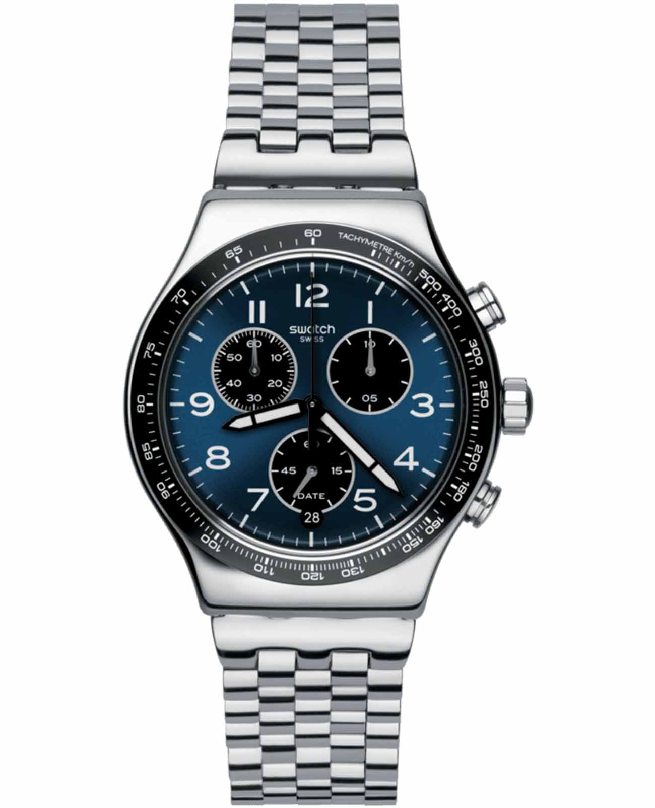 Часы Swatch YVS423GC — это стильный и современный аксессуар для тех, кто ценит лёгкость и комфорт. Этот стильный хронографХронографФункция позволяет измерять отрезки времени с особой точностью: часы, минуты, секунды. Верным признаком хронографа является наличие на циферблате 3 дополнительных окошек-счётчиков. с неподвластным времени дизайном для тех, кто всегда в пути, имеют матовый синий циферблат с белыми арабскими цифрами, серебристыми и белыми принтами, три счетчика и окошко даты в положении "6 часов". Изысканный стиль часов подчеркивают корпус из полированной нержавеющей стали и черный безельБезельВнешний ободок, закрепляющий стекло. В спортивных часах так называется поворотное кольцо с делениями на циферблате, выполняет роль таймера – замеряет отрезки времени на шкале. Неподвижный безель – элемент декора. Однонаправленно вращающийся безель на дайверских часах позволяет фиксировать моменты погружения и выныривания на поверхность. с PVDPVDУльтратонкое покрытие наносится в технике вакуумного напыления, сочетает в себе нитрид титана особой прочности со слоем золота или оксида хрома. Несёт в себе декоративную или защитную функцию. покрытием. Ремешок из полированной нержавеющей стали с традиционным узором звеньев и раскладной застёжкойРаскладная застёжкаТакой тип застёжки используется только на браслетах из металла. Она никогда не раскрывается полностью, происходит разделение на 2 и более частей. Раскладывающая застёжка снизит вероятность потери часов к минимуму. дополняют дизайн. На часовую, минутную стрелки нанесено люминесцентное покрытиеЛюминесцентное покрытиеПозволяет считывать показания времени в темноте. Производители наносят на стрелки, часовые индексы, безель или поверхность циферблата светонакопительный состав, дающий холодное свечение., которое светится в темноте, создавая необычное изображение. Водозащита 30 метров делает часы практичными для повседневного использования. Эти часы подойдут для повседневного ношения и станут ярким акцентом в вашем наряде.
