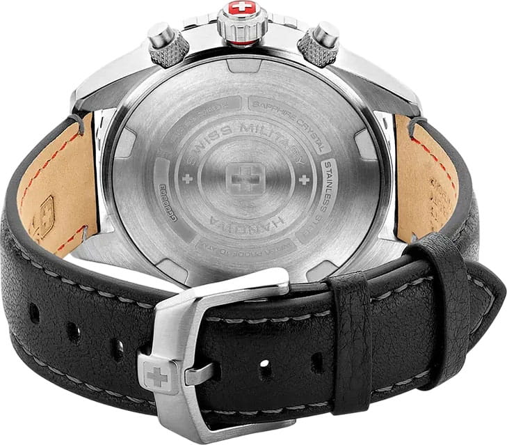 Мужские швейцарские часы Swiss Military Hanowa SMWGC0000305 – это элегантные часы, сочетающие в себе классический дизайн и современную функциональность. Корпус из нержавеющей стали диаметром 44 мм сбалансирован и элегантен. Сапфировое стеклоСапфировое стеклоПрочный и надёжный материал из кристалла сапфира синтетического происхождения, характеризующийся особой твёрдостью и устойчивостью к царапинам и повреждениям. с антибликовым покрытием защищает циферблат от царапин и обеспечивает отличную читаемость при любом освещении. Кожаный ремешок на стандартной застёжке идеально дополняют дизайн часов, обеспечивая комфортное ношение. Люминесцентное покрытиеЛюминесцентное покрытиеПозволяет считывать показания времени в темноте. Производители наносят на стрелки, часовые индексы, безель или поверхность циферблата светонакопительный состав, дающий холодное свечение. стрелок и меток позволит вам следить за временем даже в полной темноте. Стальной безельБезельВнешний ободок, закрепляющий стекло. В спортивных часах так называется поворотное кольцо с делениями на циферблате, выполняет роль таймера – замеряет отрезки времени на шкале. Неподвижный безель – элемент декора. Однонаправленно вращающийся безель на дайверских часах позволяет фиксировать моменты погружения и выныривания на поверхность. с PVD-покрытиемPVDУльтратонкое покрытие наносится в технике вакуумного напыления, сочетает в себе нитрид титана особой прочности со слоем золота или оксида хрома. Несёт в себе декоративную или защитную функцию.. Часы оснащены центральной секундной стрелкой и окошком даты в положении «6 часов», что делает их функциональными для повседневного использования. Завинчивающаяся прозрачная задняя крышка, тахиметрТахиметрРазмеченная шкала, располагается на ободке или безеле часов. Тахиметр позволяет рассчитать скорость на определённом участке пути, расстояние измеряется в километрах или милях. по внешнему краю. Водонепроницаемость до 100 метров. Идеальный выбор для тех, кто ценит качество и долговечность.