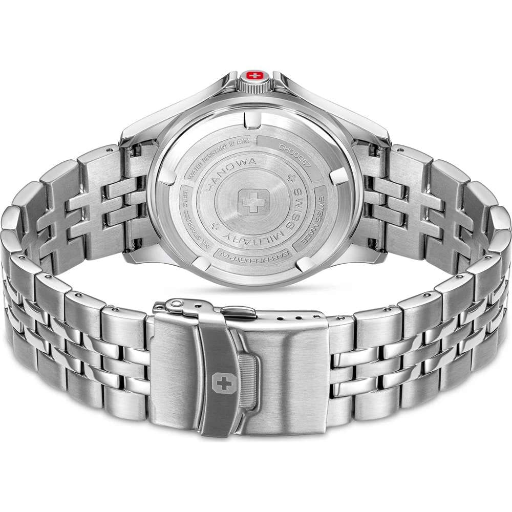 Мужские кварцевые часы Swiss Military Hanowa — швейцарская надёжность в классическом исполнении. Корпус круглый, из нержавеющей стали, диаметром 42 мм. Циферблат — синий с серебристыми стрелками. Стекло — сапфировоеСапфировое стеклоПрочный и надёжный материал из кристалла сапфира синтетического происхождения, характеризующийся особой твёрдостью и устойчивостью к царапинам и повреждениям.. Механизм — швейцарский кварцевый Ronda 505 с функцией **hack** (остановка секундной стрелки для точной настройки). БезельБезельВнешний ободок, закрепляющий стекло. В спортивных часах так называется поворотное кольцо с делениями на циферблате, выполняет роль таймера – замеряет отрезки времени на шкале. Неподвижный безель – элемент декора. Однонаправленно вращающийся безель на дайверских часах позволяет фиксировать моменты погружения и выныривания на поверхность. — неподвижный, из нержавеющей стали с IP-покрытиемIP-покрытиеМетод ионного напыления. Демонстрирует повышенную устойчивость к истиранию, окислению и химическим веществам. Под воздействием высокого давления и температуры около 1500°C молекулы металла надёжно соединяются с частицами корпуса часов.. Задняя крышка — завинчивающаяся. Водонепроницаемость 100 м. Браслет — стальной, на раскладной застёжке с кнопками и фиксаторомРаскладная застёжкаТакой тип застёжки используется только на браслетах из металла. Она никогда не раскрывается полностью, происходит разделение на 2 и более частей. Раскладывающая застёжка снизит вероятность потери часов к минимуму.. Идеальный выбор для тех, кто ценит швейцарское качество и классический стиль.