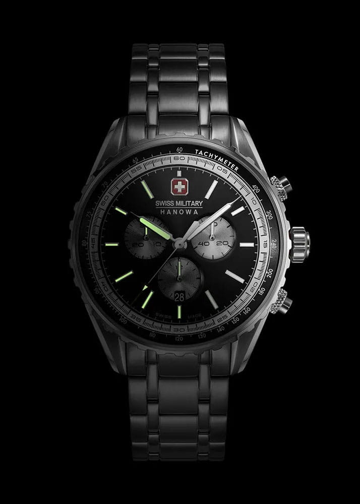 Мужские швейцарские часы Swiss Military Hanowa Afterburn Chrono SMWGI0000309 с хронографомХронографФункция позволяет измерять отрезки времени с особой точностью: часы, минуты, секунды. Верным признаком хронографа является наличие на циферблате 3 дополнительных окошек-счётчиков. и секундомеромСекундомерСекундоме́р — прибор, способный измерять интервалы времени с точностью до долей секунды.. Сапфировое стеклоСапфировое стеклоПрочный и надёжный материал из кристалла сапфира синтетического происхождения, характеризующийся особой твёрдостью и устойчивостью к царапинам и повреждениям. с антибликовым покрытием защищает циферблат от царапин и обеспечивает отличную читаемость при любом освещении. Корпус из нержавеющей стали диаметром 44 мм сбалансирован и элегантен. Браслет с раскладной застёжкойРаскладная застёжкаТакой тип застёжки используется только на браслетах из металла. Она никогда не раскрывается полностью, происходит разделение на 2 и более частей. Раскладывающая застёжка снизит вероятность потери часов к минимуму. идеально дополняют дизайн часов, обеспечивая комфортное ношение. Люминесцентное покрытиеЛюминесцентное покрытиеПозволяет считывать показания времени в темноте. Производители наносят на стрелки, часовые индексы, безель или поверхность циферблата светонакопительный состав, дающий холодное свечение. стрелок и меток позволит вам следить за временем даже в полной темноте. Стальной безельБезельВнешний ободок, закрепляющий стекло. В спортивных часах так называется поворотное кольцо с делениями на циферблате, выполняет роль таймера – замеряет отрезки времени на шкале. Неподвижный безель – элемент декора. Однонаправленно вращающийся безель на дайверских часах позволяет фиксировать моменты погружения и выныривания на поверхность. с PVD-покрытиемPVDУльтратонкое покрытие наносится в технике вакуумного напыления, сочетает в себе нитрид титана особой прочности со слоем золота или оксида хрома. Несёт в себе декоративную или защитную функцию.. Часы оснащены центральной секундной стрелкой и окошком даты в положении «6 часов», что делает их функциональными для повседневного использования. ТахиметрТахиметрРазмеченная шкала, располагается на ободке или безеле часов. Тахиметр позволяет рассчитать скорость на определённом участке пути, расстояние измеряется в километрах или милях. по внешнему краю. Водонепроницаемость до 100 метров. Идеальный выбор для тех, кто ценит качество и долговечность.