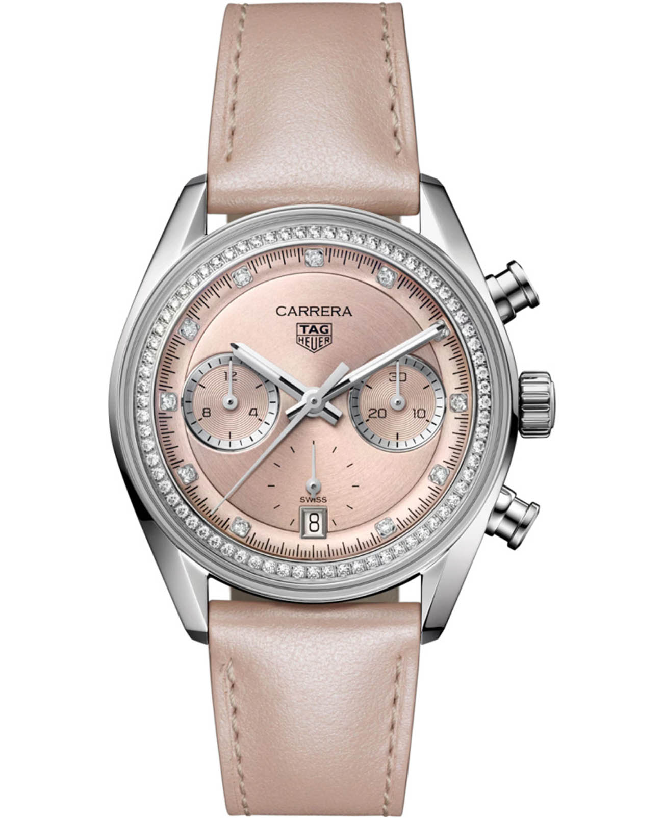 Роскошная версия шикарных TAG Heuer Carrera Chronograph CBS2215.FC6568 с бриллиантами. Престижные часы TAG Heuer Carrera сочетают в себе производительность и поразительную роскошь, создавая воодушевляющий и непринужденный элегантный образ. Часы оснащены мануфактурным механизмом TAG Heuer TH20-00. Утончённый циферблат пудрового розового цвета являет собой совершенную форму часового искусства. На матовом и полированном корпусе из стали можно увидеть сапфировое стеклоСапфировое стеклоПрочный и надёжный материал из кристалла сапфира синтетического происхождения, характеризующийся особой твёрдостью и устойчивостью к царапинам и повреждениям.. Элегантный циферблат дополняют индексы из 11 бриллиантов и роскошный безельБезельВнешний ободок, закрепляющий стекло. В спортивных часах так называется поворотное кольцо с делениями на циферблате, выполняет роль таймера – замеряет отрезки времени на шкале. Неподвижный безель – элемент декора. Однонаправленно вращающийся безель на дайверских часах позволяет фиксировать моменты погружения и выныривания на поверхность. из полированной стали с 72 бриллиантами. Ремень с раскладной застёжкойРаскладная застёжкаТакой тип застёжки используется только на браслетах из металла. Она никогда не раскрывается полностью, происходит разделение на 2 и более частей. Раскладывающая застёжка снизит вероятность потери часов к минимуму.. Часы с люминесцентным покрытиемЛюминесцентное покрытиеПозволяет считывать показания времени в темноте. Производители наносят на стрелки, часовые индексы, безель или поверхность циферблата светонакопительный состав, дающий холодное свечение. с хронографом ХронографФункция позволяет измерять отрезки времени с особой точностью: часы, минуты, секунды. Верным признаком хронографа является наличие на циферблате 3 дополнительных окошек-счётчиков. и секундомеромСекундомерСекундоме́р — прибор, способный измерять интервалы времени с точностью до долей секунды..