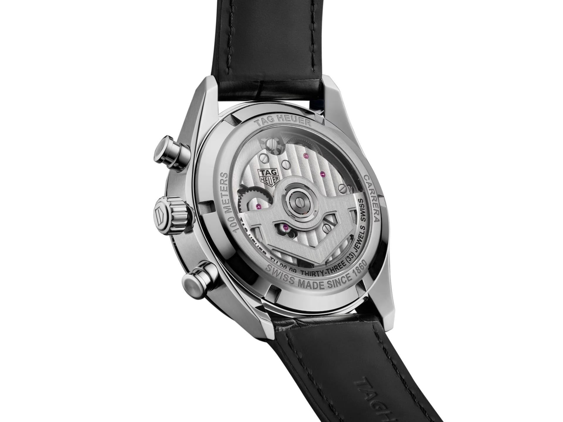 Швейцарские часы-хронографХронографФункция позволяет измерять отрезки времени с особой точностью: часы, минуты, секунды. Верным признаком хронографа является наличие на циферблате 3 дополнительных окошек-счётчиков. TAG Heuer Carrera Chronograph Tourbillon CBS5011.FC6566. Механический механизм (автоматический калибр) с высокой точностью. Сапфировое стеклоСапфировое стеклоПрочный и надёжный материал из кристалла сапфира синтетического происхождения, характеризующийся особой твёрдостью и устойчивостью к царапинам и повреждениям. устойчивое к появлению царапин, обладающее высокой прозрачностью. Стрелки и метки с люминесцентным покрытиемЛюминесцентное покрытиеПозволяет считывать показания времени в темноте. Производители наносят на стрелки, часовые индексы, безель или поверхность циферблата светонакопительный состав, дающий холодное свечение.. Класс водозащиты: 100 метров, позволит плавать, нырять и заниматься другими водными видами спорта. Корпус часов изготовлен из нержавеющей стали. Кожаный ремешок с раскладной застёжкойРаскладная застёжкаТакой тип застёжки используется только на браслетах из металла. Она никогда не раскрывается полностью, происходит разделение на 2 и более частей. Раскладывающая застёжка снизит вероятность потери часов к минимуму..