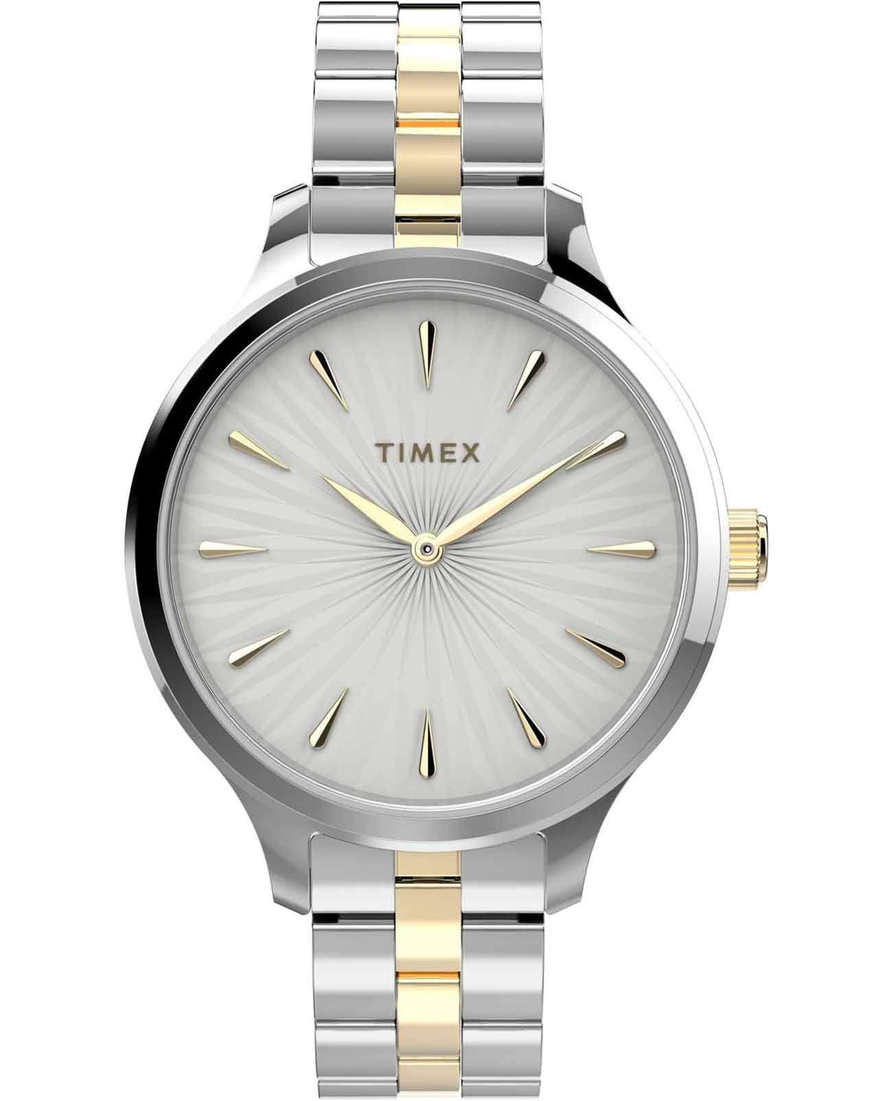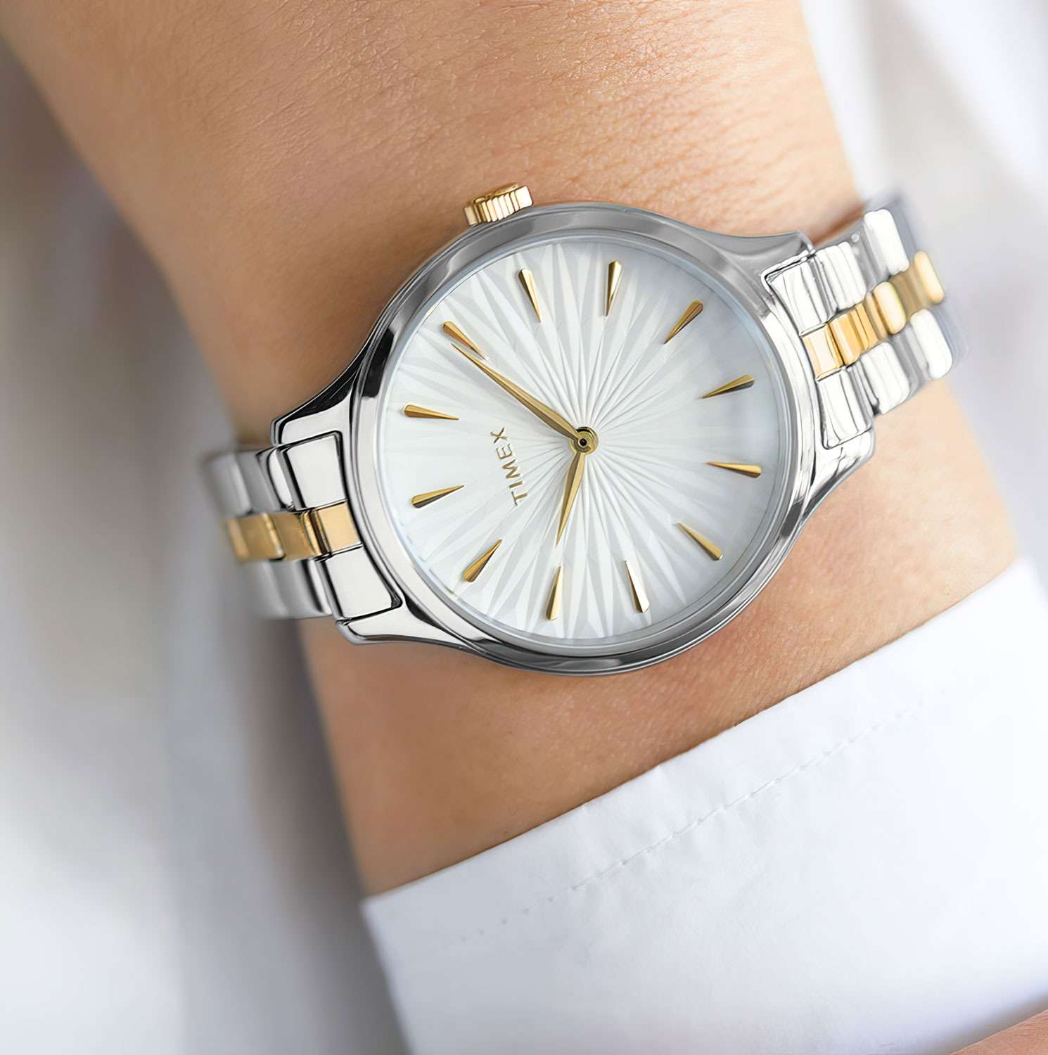 Наручные часы Timex TW2V06500 — это изящный аксессуар, который подчеркнет превосходный вкус своей обладательницы. Изготовленные в США, эти практичные женские часы оснащены надежным кварцевым механизмом, обеспечивающим точность хода. Корпус часов выполнен из латуни, которое придает изделию изысканный и современный вид. Белый циферблат украшен рельефным декоративным узором и оснащен листовидными стрелками в стиле Feuille, что обеспечивает элегантный внешний вид. Метки в виде штрихов и отсутствие секундной стрелки придают модели минималистичный стиль. Часы оснащены рифленой заводной головкой и надежным стальным браслетом с частичным PVDPVDУльтратонкое покрытие наносится в технике вакуумного напыления, сочетает в себе нитрид титана особой прочности со слоем золота или оксида хрома. Несёт в себе декоративную или защитную функцию. покрытием, который имеет раскладную застёжкуРаскладная застёжкаТакой тип застёжки используется только на браслетах из металла. Она никогда не раскрывается полностью, происходит разделение на 2 и более частей. Раскладывающая застёжка снизит вероятность потери часов к минимуму. для комфортной посадки на запястье. Водозащита 30WR позволяет носить часы в различных условиях, защищая их от случайных брызг. Минеральное стеклоМинеральное стеклоМинеральное стекло представляет собой искусственно выращенный минерал кварца. Такое стекло отличается особой устойчивостью к повреждениям и царапинам. Уступает по некоторым качествам сапфировому стеклу. защищает циферблат от царапин и повреждений, сохраняя его первозданный вид. Размеры корпуса составляют 36 мм в диаметре, а ширина браслета — 14 мм, что делает часы элегантными и подходящими для любого случая.
