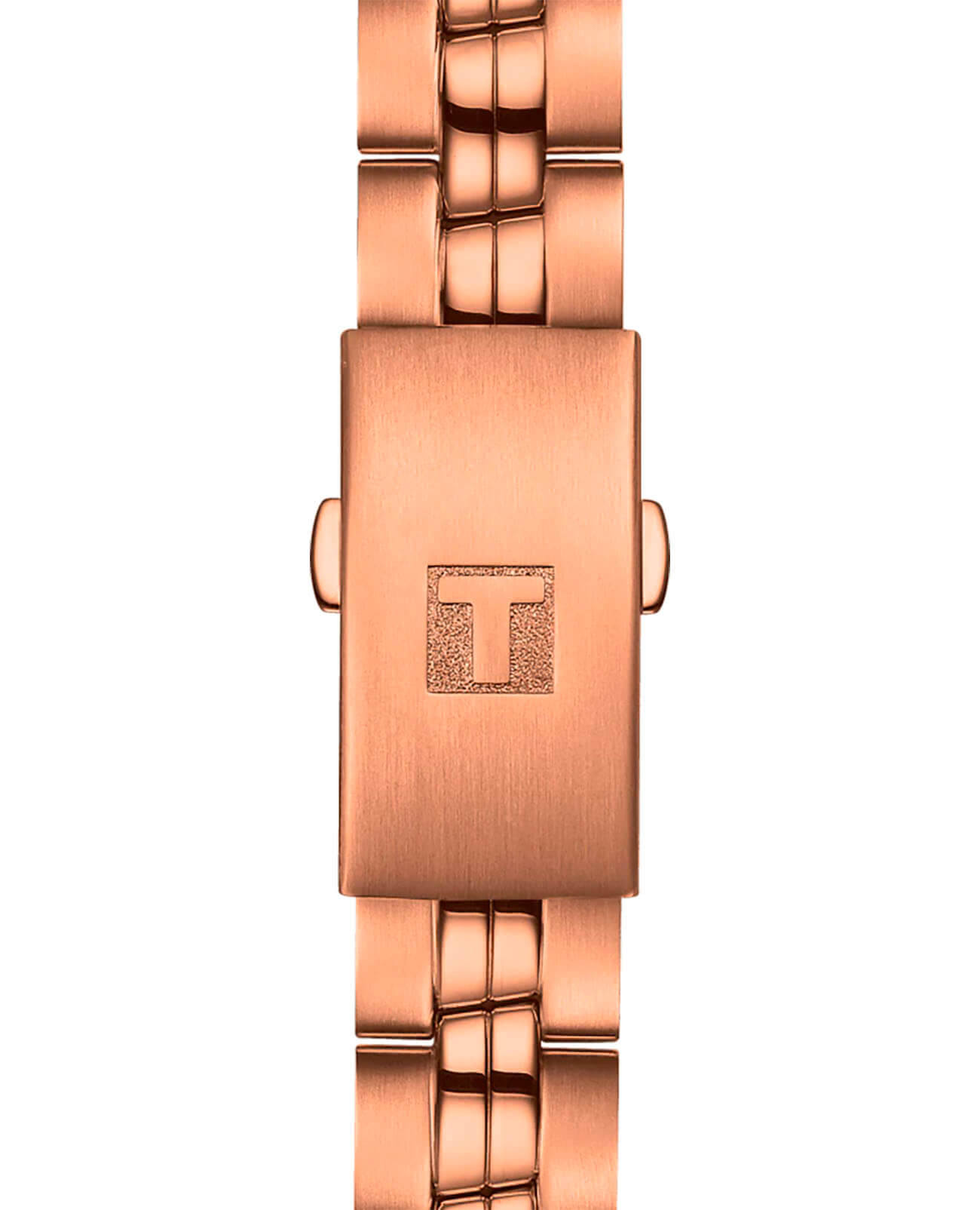 Часы являются воплощением традиций Tissot и элегантности, модель в цвете розового золота будет уместна на любом мероприятии. Такой оттенок образуется благодаря PVD-покрытиюPVDУльтратонкое покрытие наносится в технике вакуумного напыления, сочетает в себе нитрид титана особой прочности со слоем золота или оксида хрома. Несёт в себе декоративную или защитную функцию., устойчивому к царапинам и повреждениям. Кварцевый высокоточный калибр ETA F04.111. Сапфировое стекло. Люминесцентное покрытиеЛюминесцентное покрытиеПозволяет считывать показания времени в темноте. Производители наносят на стрелки, часовые индексы, безель или поверхность циферблата светонакопительный состав, дающий холодное свечение. стрелок. Водостойкость 100 метров. Застёжка бабочка с кнопками. Функционал: EOLEOLПредставляет собой систему, уведомляющую владельца часов о необходимости замены элемента питания. За 2 недели до полного разряда батарейки секундная стрелка перестаёт ходить чётко и начинает перепрыгивать на 3-4 деления., индикация даты. Габариты: 33 x 33 x 9 мм.