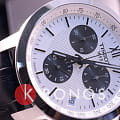 Модель сочетает в себе белый, чёрный, серебристый цвет, подобное исполнение позволяет носить их даже с одеждой самых смелых оттенков. Секундная стрелка выполнена в виде шпаги, необычный узор украшает массивный циферблат с дополнительными счётчиками хронографаХронографФункция позволяет измерять отрезки времени с особой точностью: часы, минуты, секунды. Верным признаком хронографа является наличие на циферблате 3 дополнительных окошек-счётчиков.. Кварцевый калибр ETA G10.211 с 4 камнями. Ремешок из натуральной кожи с тиснением под кожу крокодила. Стальной ударопрочный корпус. Хронограф, тахиметрТахиметрРазмеченная шкала, располагается на ободке или безеле часов. Тахиметр позволяет рассчитать скорость на определённом участке пути, расстояние измеряется в километрах или милях., секундомер, дата. Габариты: 41 x 42 x 12 мм.