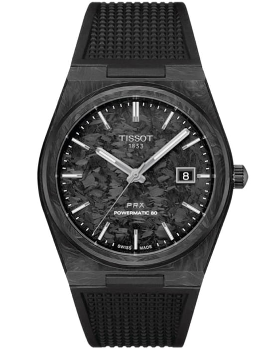 Часы Tissot PRX Powermatic 80 Carbon T137.907.97.201.00 имеют корпус из карбона. Защищает циферблат устойчивое к царапинам сапфировое стеклоСапфировое стеклоПрочный и надёжный материал из кристалла сапфира синтетического происхождения, характеризующийся особой твёрдостью и устойчивостью к царапинам и повреждениям.. Стрелки с люминесцентным покрытиемЛюминесцентное покрытиеПозволяет считывать показания времени в темноте. Производители наносят на стрелки, часовые индексы, безель или поверхность циферблата светонакопительный состав, дающий холодное свечение.. Окошко даты находится в положении 3 часа. Прозрачная задняя крышка. Класс водозащиты: 100 метров, позволит плавать, нырять и заниматься другими водными видами спорта (без погружений). Ремень из каучука на стандартной застежке.