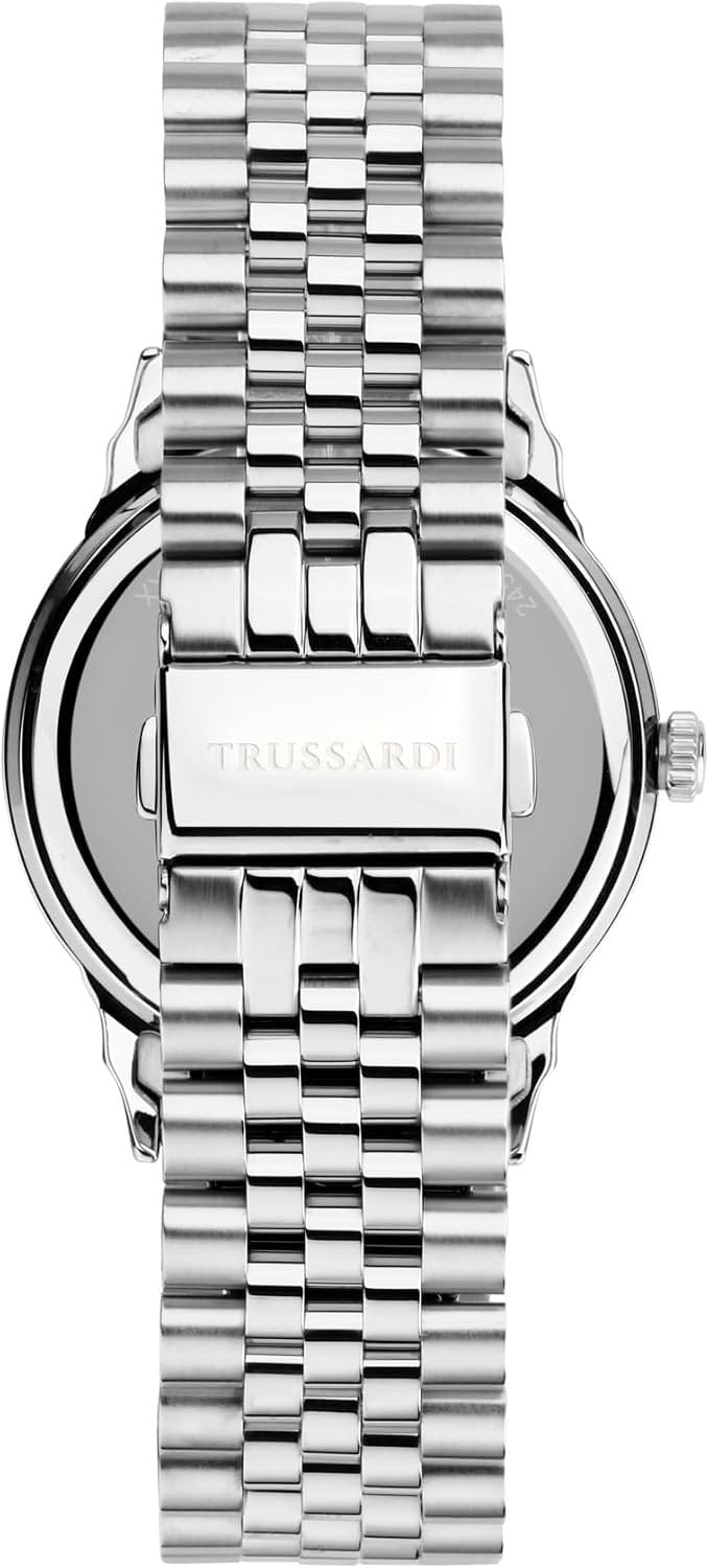 Итальянские мужские часы Trussardi T-Bent R2453141010 - это стильный мужской аксессуар, который сочетает элегантный дизайн и практичность. Корпус выполнен из нержавеющей стали, что обеспечивает долговечность и утончённый внешний вид. Надежное минеральное стеклоМинеральное стеклоМинеральное стекло представляет собой искусственно выращенный минерал кварца. Такое стекло отличается особой устойчивостью к повреждениям и царапинам. Уступает по некоторым качествам сапфировому стеклу. защищает циферблат от царапин и обеспечивает долговечность. Модель оснащена кварцевым механизмом, обеспечивающим высокую точность хода. Браслет из нержавеющей стали с раскладной застёжкойРаскладная застёжкаТакой тип застёжки используется только на браслетах из металла. Она никогда не раскрывается полностью, происходит разделение на 2 и более частей. Раскладывающая застёжка снизит вероятность потери часов к минимуму. обеспечивает комфортное ношение. Водозащита 50 метров позволит защитить корпус от случайных брызг или капель дождя.  Окошки даты и дня недели находятся в положении 3 часа. Стрелки и метки оснащены люминесцентным покрытиемЛюминесцентное покрытиеПозволяет считывать показания времени в темноте. Производители наносят на стрелки, часовые индексы, безель или поверхность циферблата светонакопительный состав, дающий холодное свечение., обеспечивающим отличную видимость даже при слабом освещении. Эта модель – отличный выбор для тех, кто ищет сочетание стиля, качества и функциональности. Часы станут не только полезным аксессуаром, но и выразительным элементом вашего имиджа.