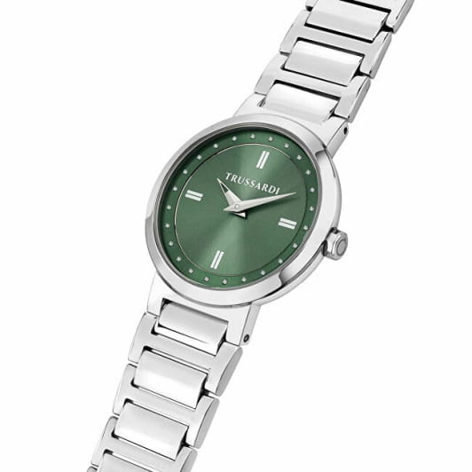 Итальянские женские часы Trussardi T-Bridge R2453171509 - это стильный женский аксессуар, который сочетает элегантный дизайн и практичность. Корпус выполнен из нержавеющей стали, что обеспечивает долговечность и утончённый внешний вид. Надежное минеральное стеклоМинеральное стеклоМинеральное стекло представляет собой искусственно выращенный минерал кварца. Такое стекло отличается особой устойчивостью к повреждениям и царапинам. Уступает по некоторым качествам сапфировому стеклу. защищает циферблат с кристаллами от царапин и обеспечивает долговечность. Модель оснащена кварцевым механизмом, обеспечивающим высокую точность хода. Браслет из нержавеющей стали на раскладной застёжкеРаскладная застёжкаТакой тип застёжки используется только на браслетах из металла. Она никогда не раскрывается полностью, происходит разделение на 2 и более частей. Раскладывающая застёжка снизит вероятность потери часов к минимуму. обеспечивает комфортное ношение. Водозащита 50 метров позволит защитить корпус от случайных брызг или капель дождя. Эта модель – отличный выбор для тех, кто ищет сочетание стиля, качества и функциональности. Часы станут не только полезным аксессуаром, но и выразительным элементом вашего имиджа. В комплекте браслет.