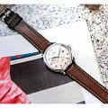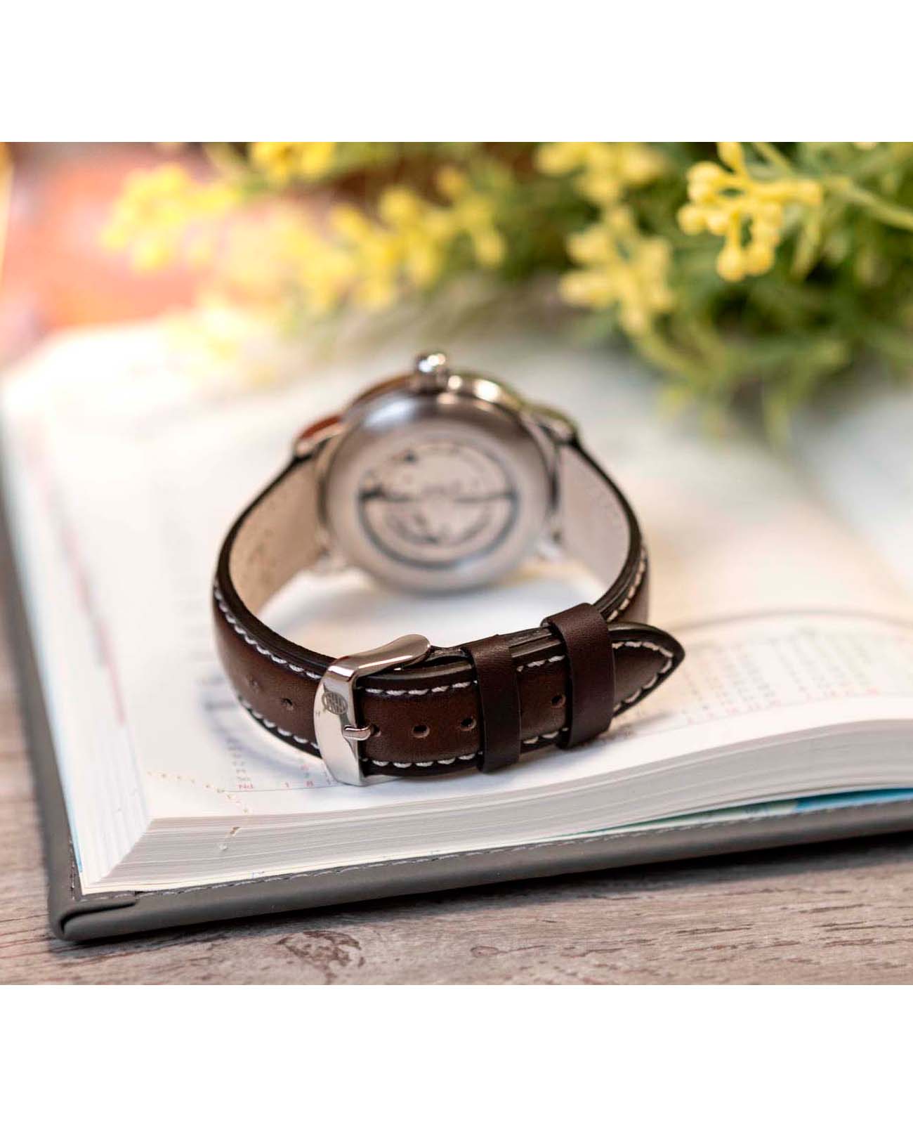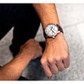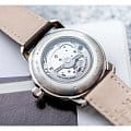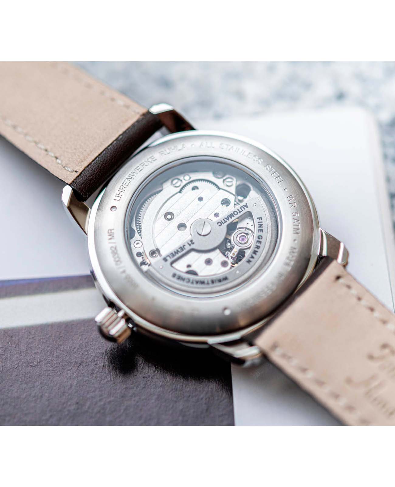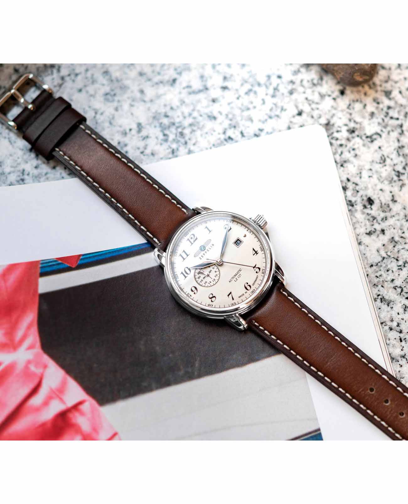 Мужские наручные часы Zeppelin 86684 из коллекции LZ127 Graf Zeppelin сочетают в себе классический дизайн и надежность современных технологий. Модель обладает круглым корпусом диаметром 40 мм, изготовленным из нержавеющей стали, что обеспечивает высокую устойчивость к внешним воздействиям. Браслет выполнен из кожи, гарантирующей комфортное ношение. Белый циферблат оснащен индикаторами часов, минут и секунд, а также окном даты. Для защиты используется минеральное стеклоМинеральное стеклоМинеральное стекло представляет собой искусственно выращенный минерал кварца. Такое стекло отличается особой устойчивостью к повреждениям и царапинам. Уступает по некоторым качествам сапфировому стеклу., обеспечивающее прочную защиту от царапин. Часы работают на автоматическом механизме с автоподзаводом, который содержит 21 драгоценный камень, что снижает трение и увеличивает запас хода и точность работы. Модель также имеет функцию второго часового поясаВторой часовой поясФункция, позволяющая отображать время двух часовых поясов одновременно., делая ее идеальной для путешествий или работы в международном формате. Водонепроницаемость часов достигает 5 атмосфер (50 метров), что позволяет использовать их во время плавания на поверхности, однако не рекомендуется для глубоководного дайвинга или занятий водными видами спорта с высоким уровнем активности.