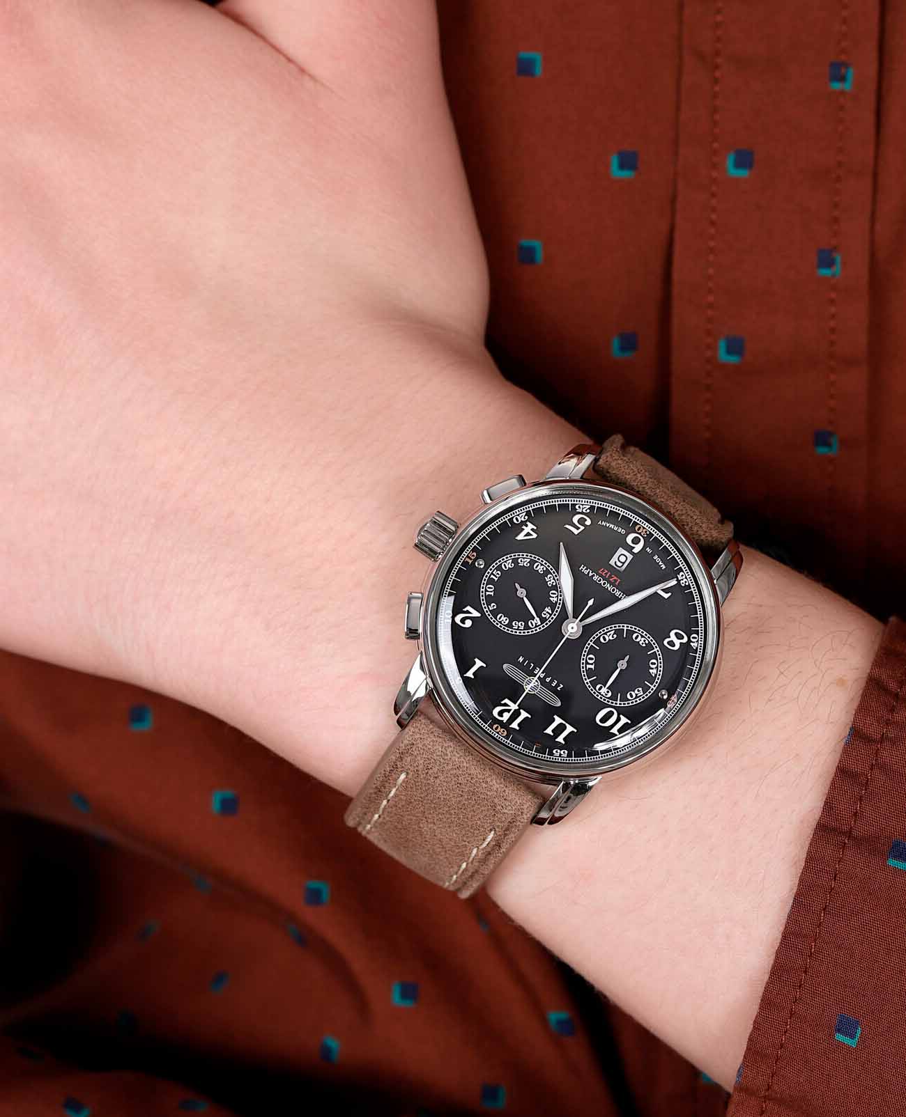 Мужские наручные часы-хронографХронографФункция позволяет измерять отрезки времени с особой точностью: часы, минуты, секунды. Верным признаком хронографа является наличие на циферблате 3 дополнительных окошек-счётчиков. Zeppelin 86782 из коллекции LZ127 Graf Zeppelin сочетают в себе классический дизайн и высокую функциональность. Модель обладает круглым корпусом диаметром 42 мм, изготовленным из полированной нержавеющей стали серебристого цвета, что обеспечивает надежную защиту механизма. Браслет выполнен из прочной кожи, обеспечивающей комфортное ношение. Чёрный циферблат оснащен крупными арабскими цифрами, окном даты в положении «6 часов», индикатором бегущих секунд и шкалой хронографа для измерения времени до шестидесяти минут. Для защиты используется минеральное стеклоМинеральное стеклоМинеральное стекло представляет собой искусственно выращенный минерал кварца. Такое стекло отличается особой устойчивостью к повреждениям и царапинам. Уступает по некоторым качествам сапфировому стеклу., обеспечивающее устойчивость к царапинам. Часы работают на точном кварцевом механизме немецкого производства, гарантирующем безупречную работу без необходимости ручного подзавода. Водонепроницаемость часов достигает 5 атмосфер (50 метров), что позволяет использовать их при ежедневных контактах с водой, но не рекомендуется для погружений или активных водных видов спорта.