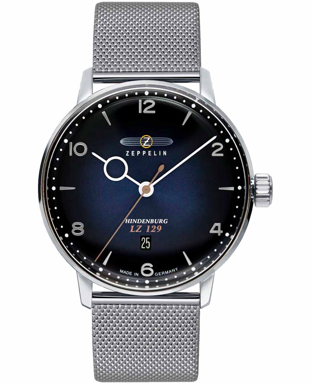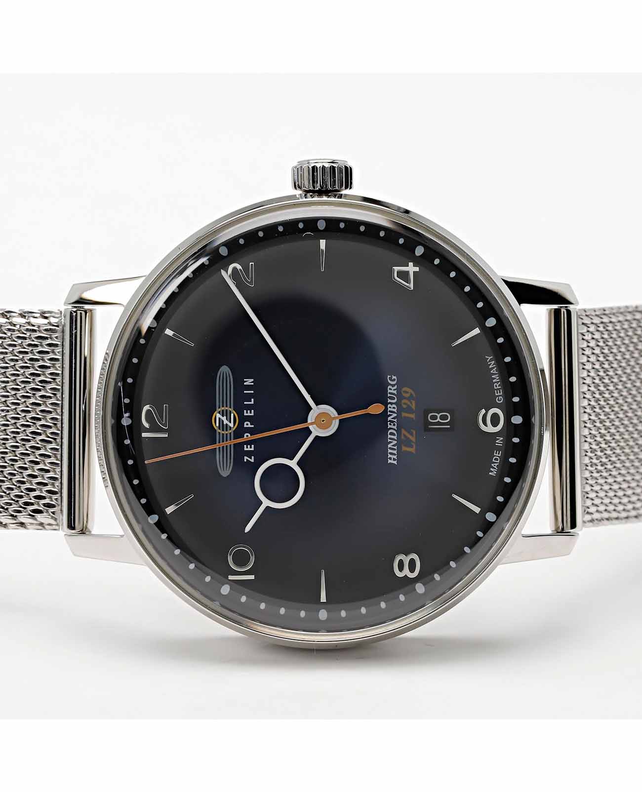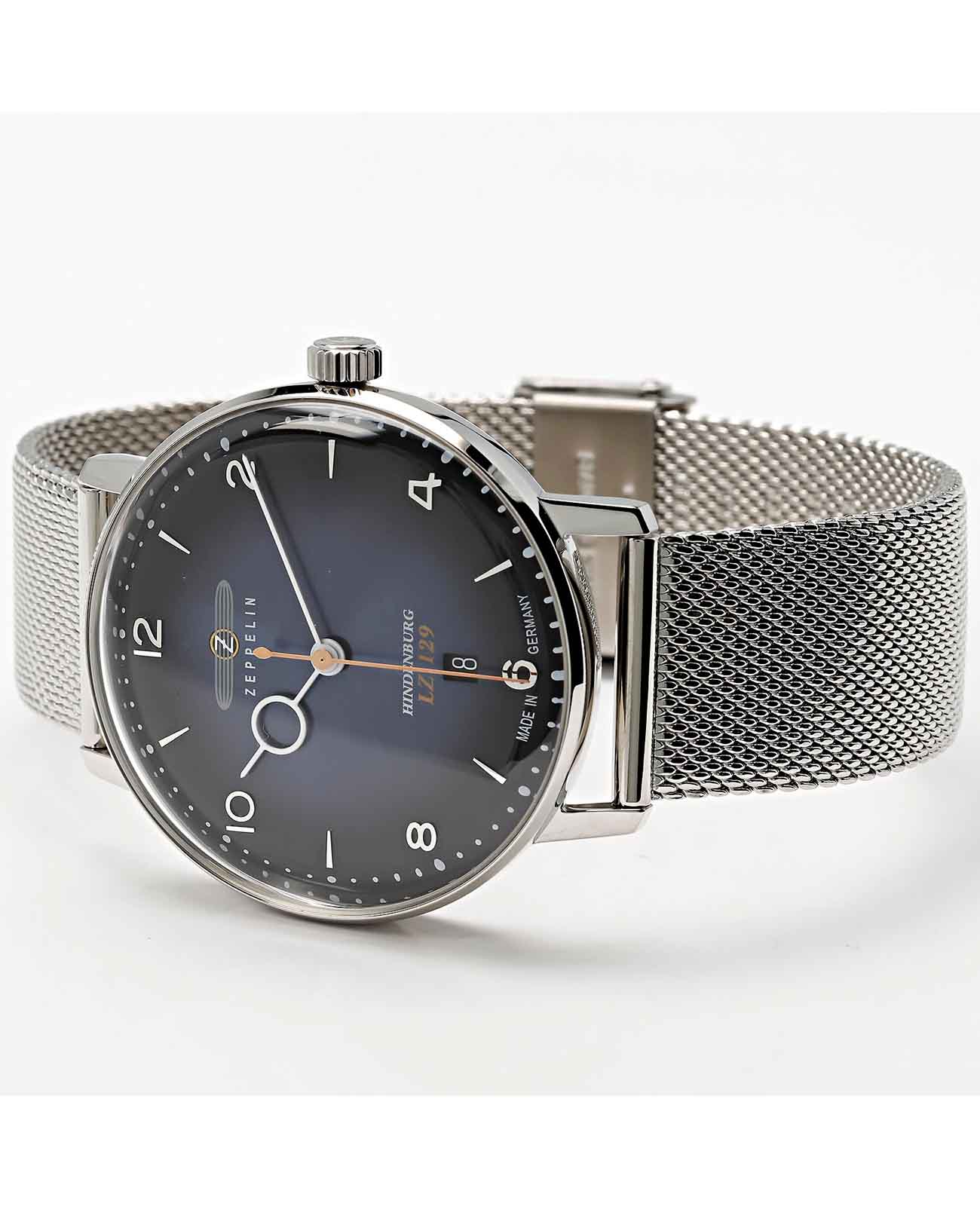 Мужские наручные часы Zeppelin LZ129 Hindenburg ZEP-8046M3 сочетают в себе классический дизайн и надежность современных технологий. Модель обладает круглым корпусом диаметром 40 мм, изготовленным из нержавеющей стали, что обеспечивает высокую устойчивость к внешним воздействиям. Браслет миланского плетения на раскладном замкеРаскладной замокДанный вариант застежки используется только на часах с металлическим браслетом. Отличительная особенность такого крепления в том, что длина браслета становится универсальной и вы можете самостоятельно отрегулировать нужный вам размер – застежка просто двигается по браслету часов., гарантирующей комфортное ношение и безопасность. Синий циферблат оснащен метками в виде штрихов и арабских цифр, а также окном даты на «6 часах». Для защиты используется минеральное стеклоМинеральное стеклоМинеральное стекло представляет собой искусственно выращенный минерал кварца. Такое стекло отличается особой устойчивостью к повреждениям и царапинам. Уступает по некоторым качествам сапфировому стеклу., обеспечивающее прочную защиту от царапин. Часы работают на кварцевом механизме, что гарантирует точное время без необходимости подзаводки. Водонепроницаемость часов достигает 5 атмосфер (50 метров), что позволяет использовать их во время плавания на поверхности, однако не рекомендуется для глубоководного дайвинга или занятий водными видами спорта с высоким уровнем активности.